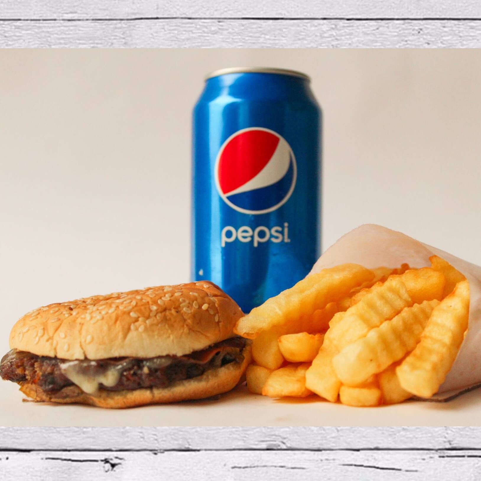 Hamburguesa sencilla 150 grs de papas fritas y refresco de 400 mlt,