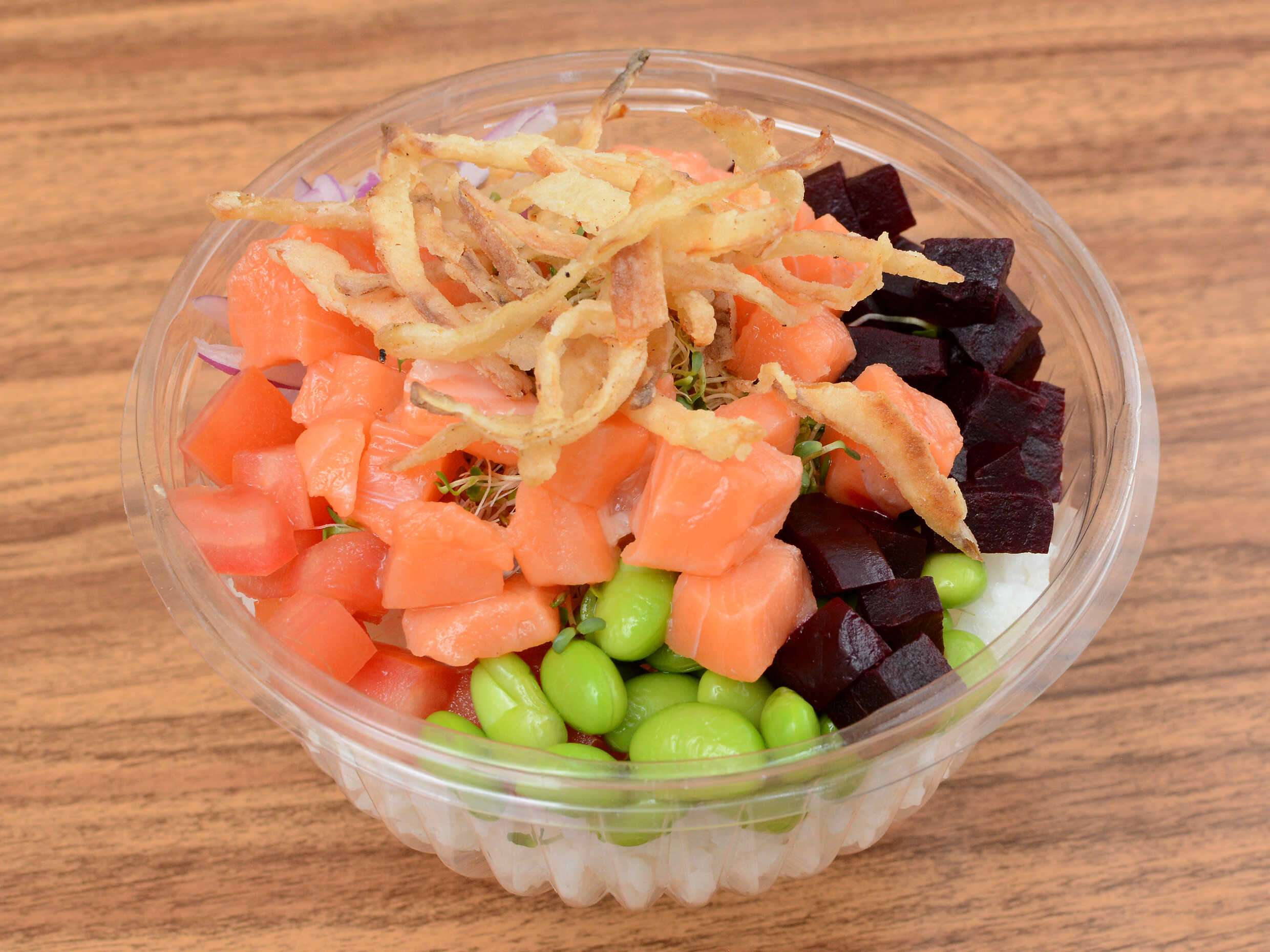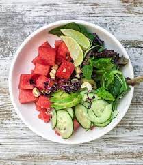 Poke vegetariano de 16oz, con sandia , rábano, edamames, zanahoria, aguacate, cilantro, semilla de girasol, furikake y chiles toreados.