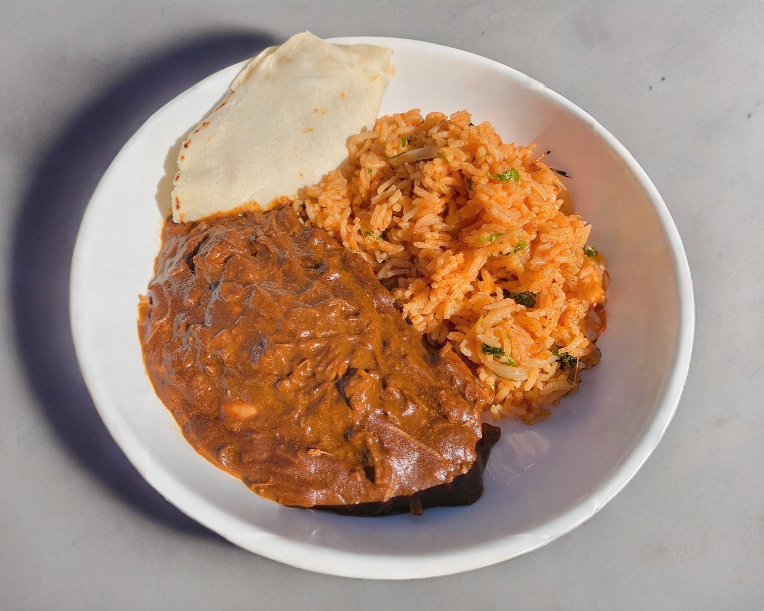 Pollo en mole ranchero, picosito, acompañado de arroz rojo y tortillas