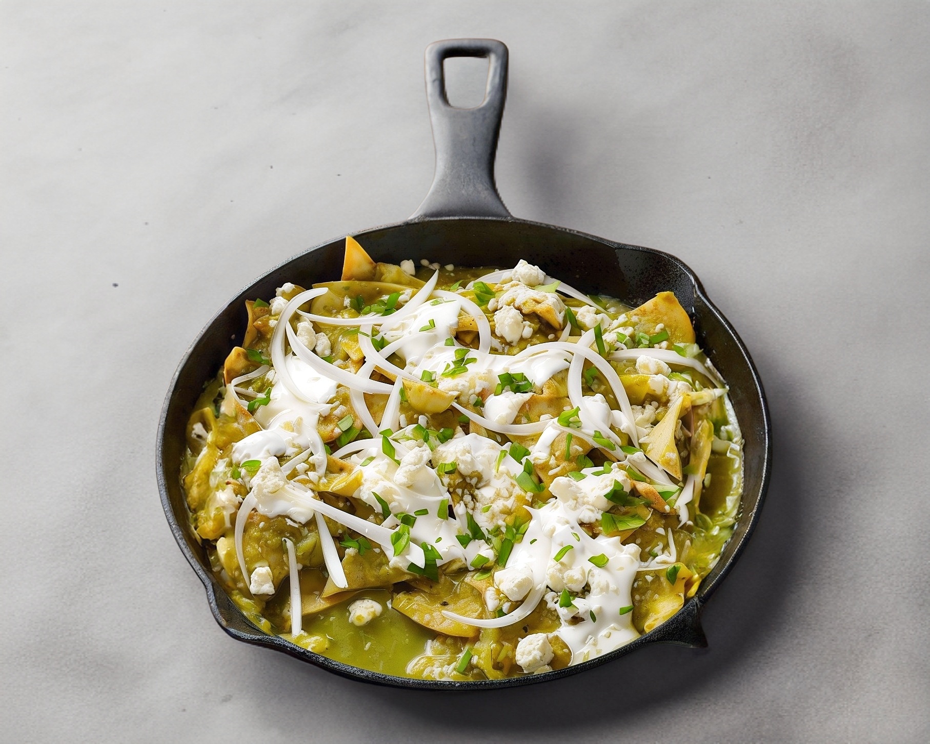 Chilaquiles de salsa verde o roja, incluye pollo, crema acida, cilantro, queso panela y cebolla morada