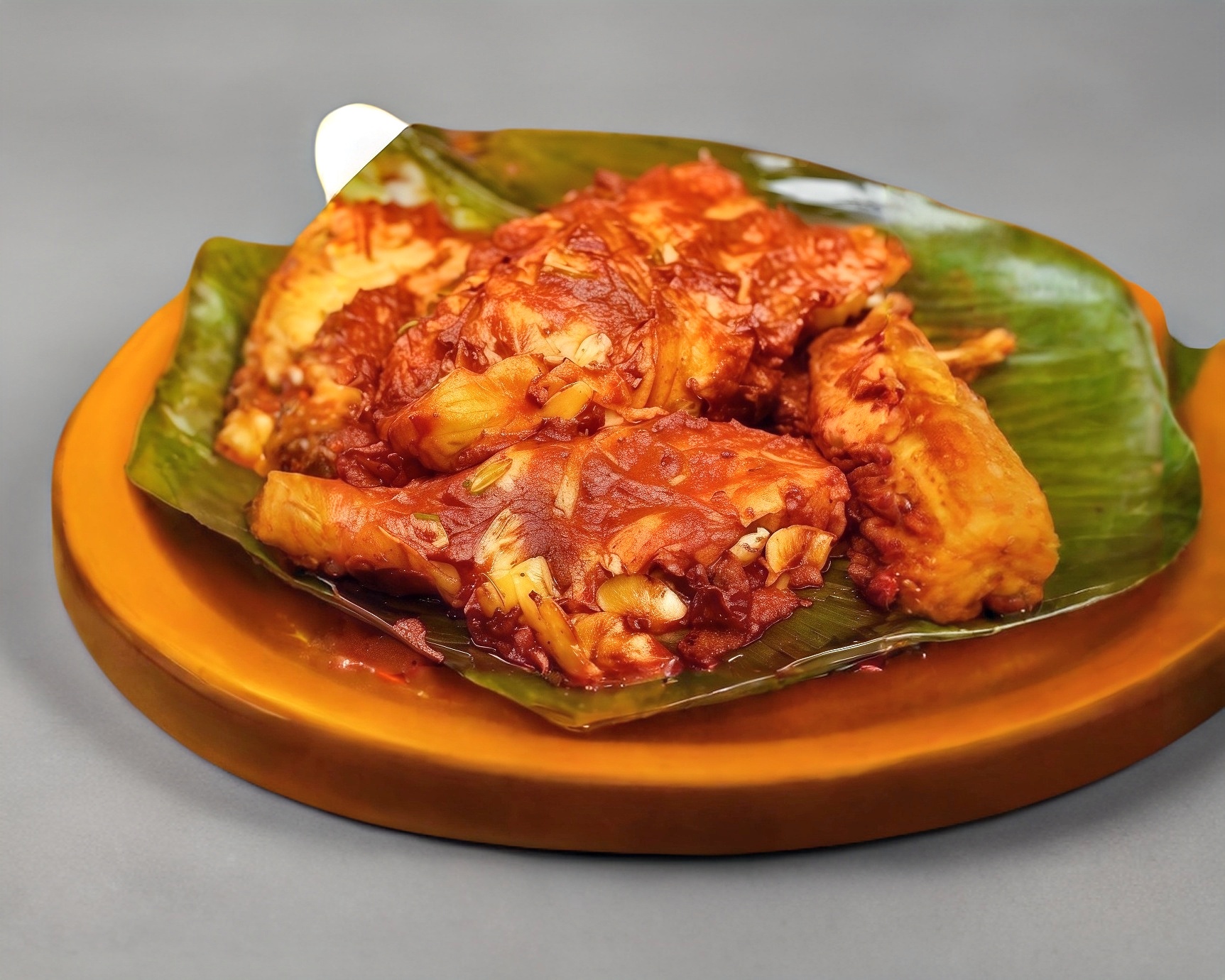 Pollo marinado por 24 horas con adobo de la casa, envuelto en un ataud de aluminio, incluye papa galeana, cebolla caramelizada, chile toreado, totopos, limones, tortillas y salsas
