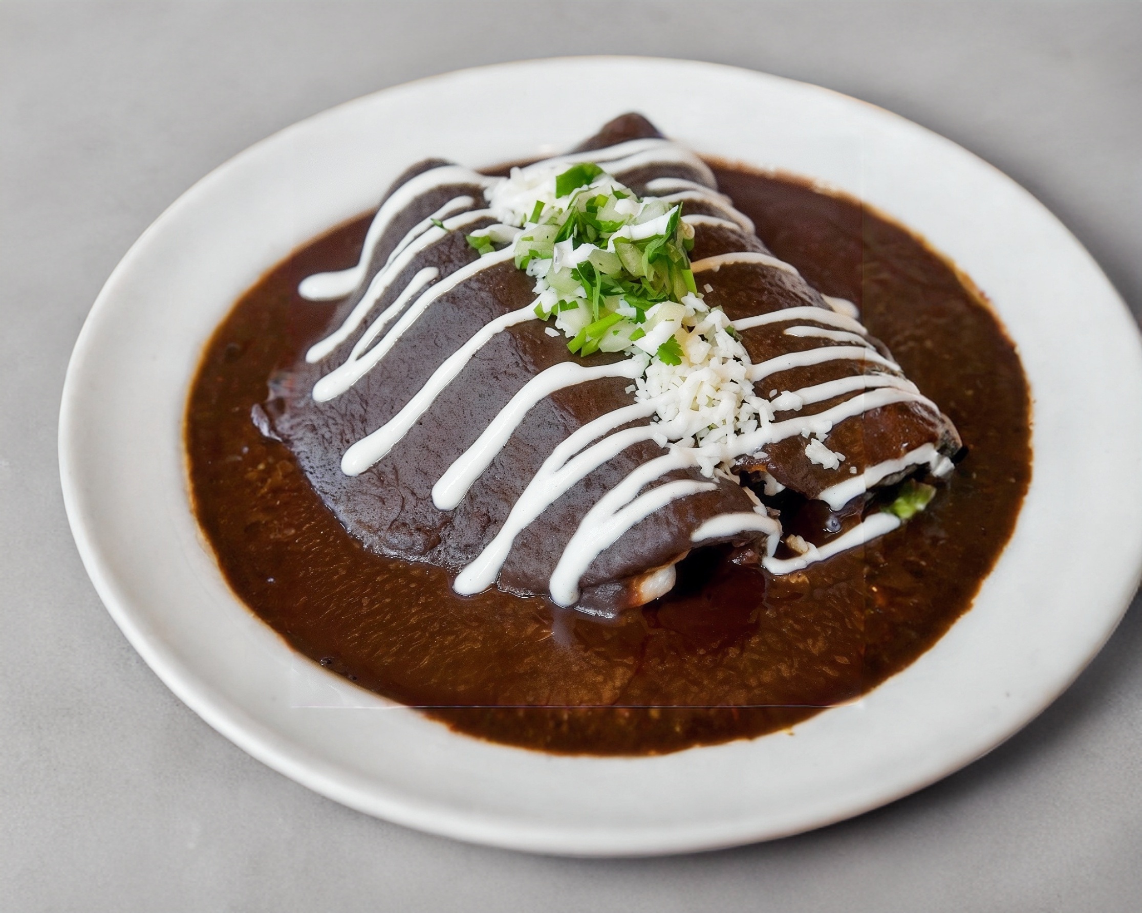 4 tacos de pollo, bañados exquisito mole ranchero de la casa, crema, queso fresco y cebolla morada, acompañado de arroz