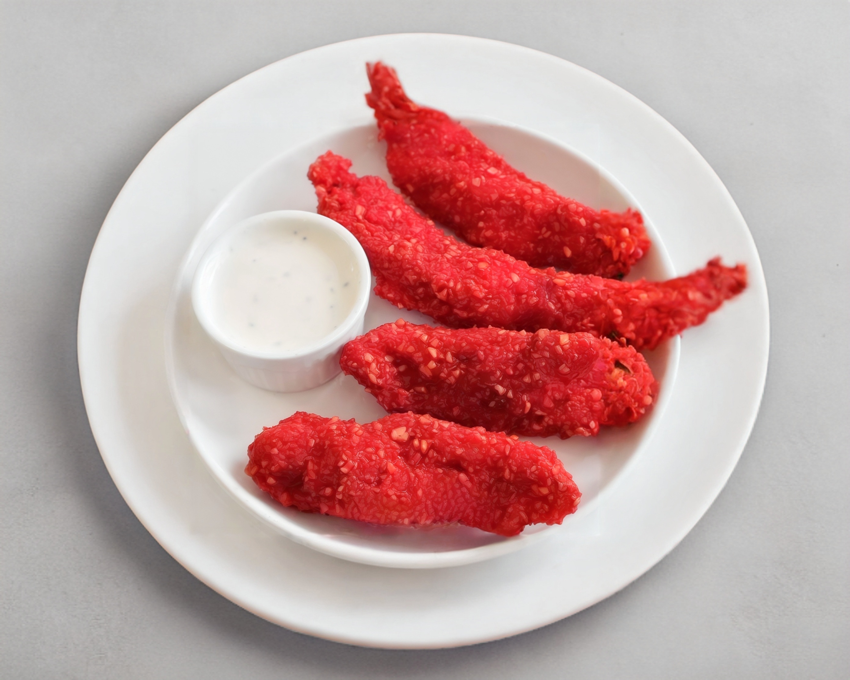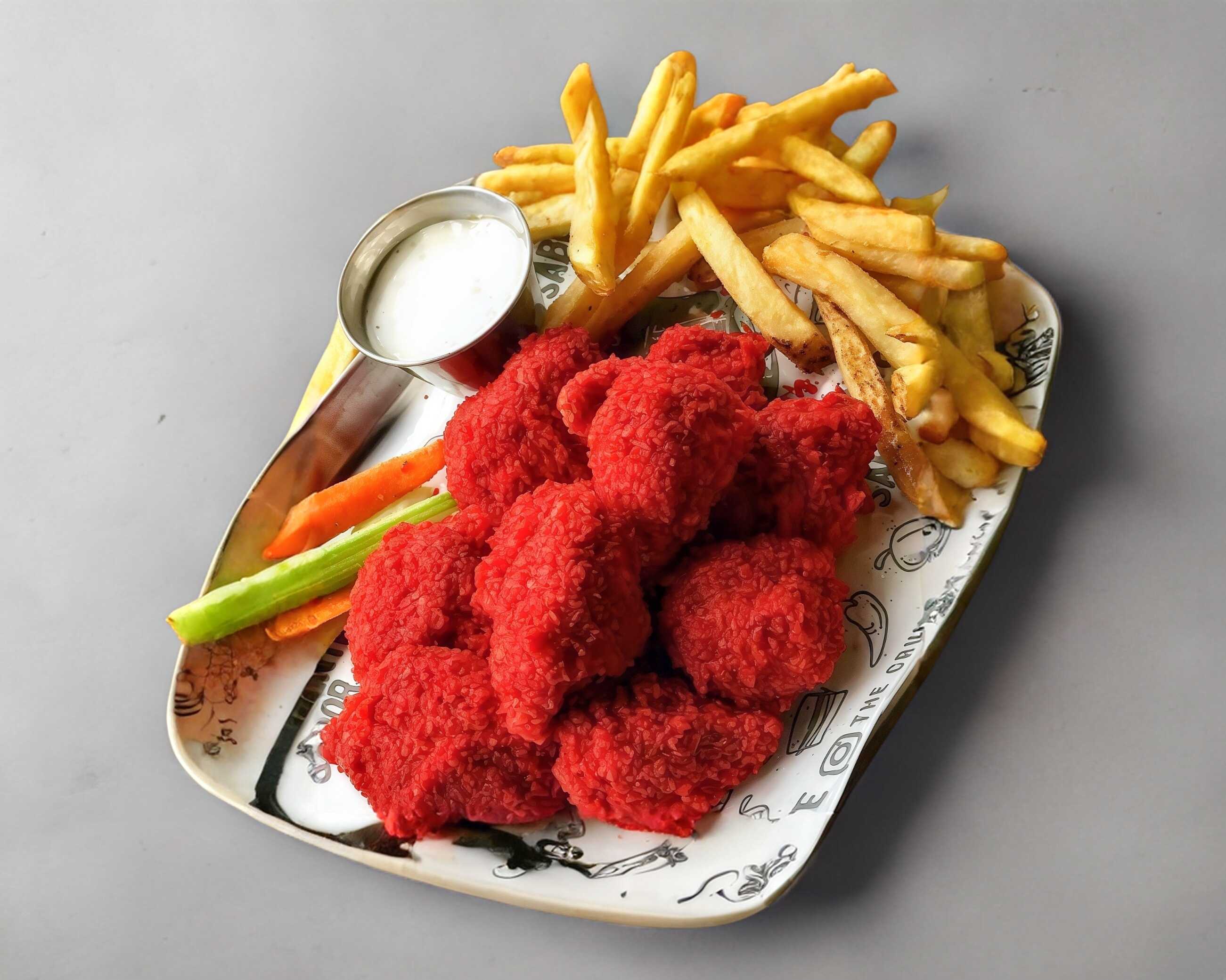 300 gramos de tiras de pechuga de pollo empanizada cubierto con sazonador original flamin hot, incluye papas a la francesa, salsa y aderezo