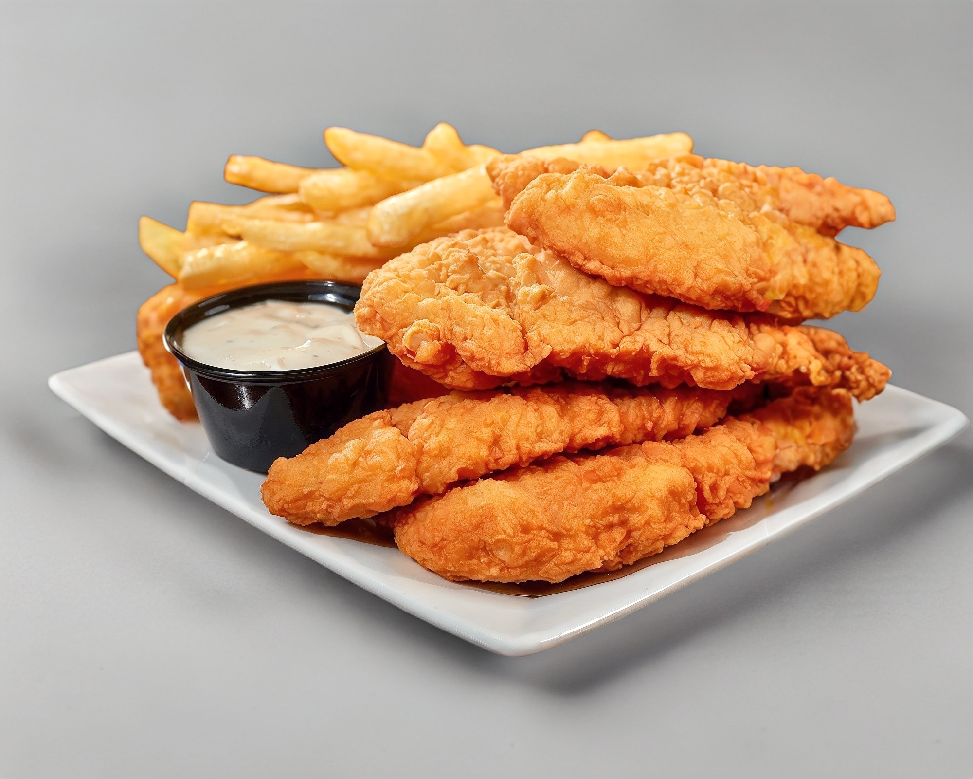 300 gramos de tiras de pechuga de pollo empanizada, jugosa por dentro, crujiente por fuera, incluye papas a la francesa, dip para chopear, salsa y aderezo, pidelos bañados o naturales
