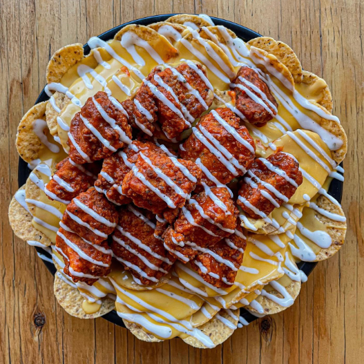 Cama de 150 grs de nachos y queso cheddar, acompañados de 150 grs de boneless bañados en la salsa y aderezo de tu preferencia, acompañados con jalapeños y tocino deshidratado