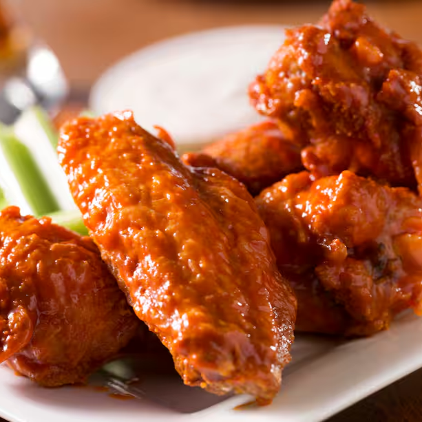 1 kilo de alitas de pollo bañadas en la salsa de su preferencia acompañadas con aderezo