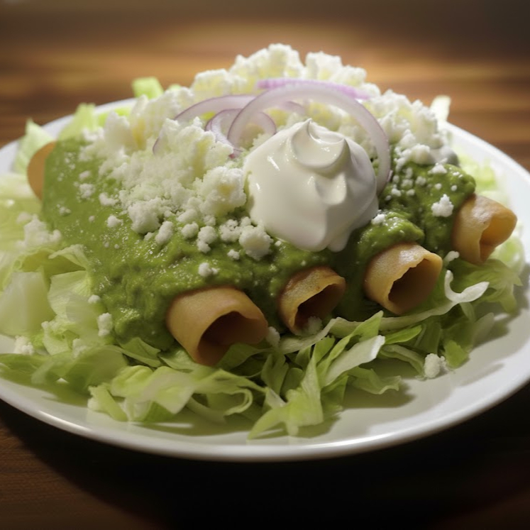 4 flautas de pollo servidas en una cama de lechuga, guacamole, crema acida, queso panela, cebolla morada, acompañadas de papas fritas y salsa casera