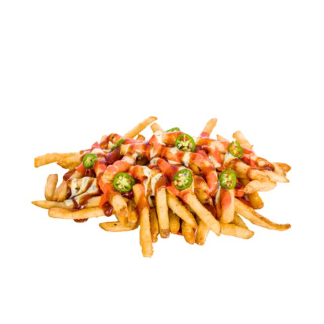 200 gramos de papas a la francesa, bañadas en salsa bbq, buffalo tfb, aderezo ranch home made y láminas de Chile Serrano fresco.