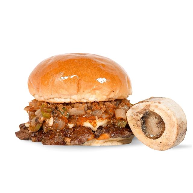 Burger en colaboración The Food Box x Carnes Ramos: carne 100% de res, atropellado de carne seca, panela a la plancha, chicharrón molido,tuetano asado