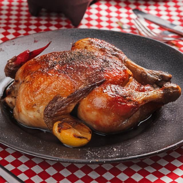Pollo entero marinado con nuestra receta original, acompañado de totopos, tortillas y salsas.