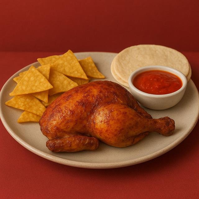 Medio Pollo marinado con la receta de la casa, acompañado de tortillas, totopos y salsa