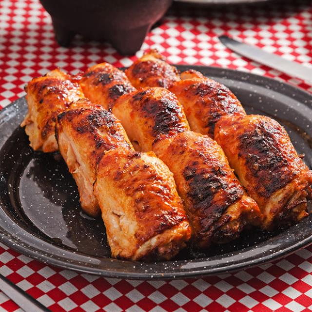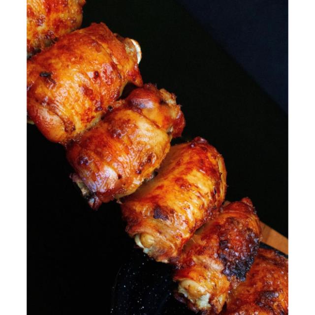 Muslos de pollo (10-12 piezas) marinados en nuestra receta original, acompañado de tortillas, totopos y salsa.