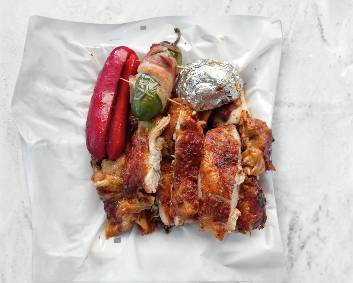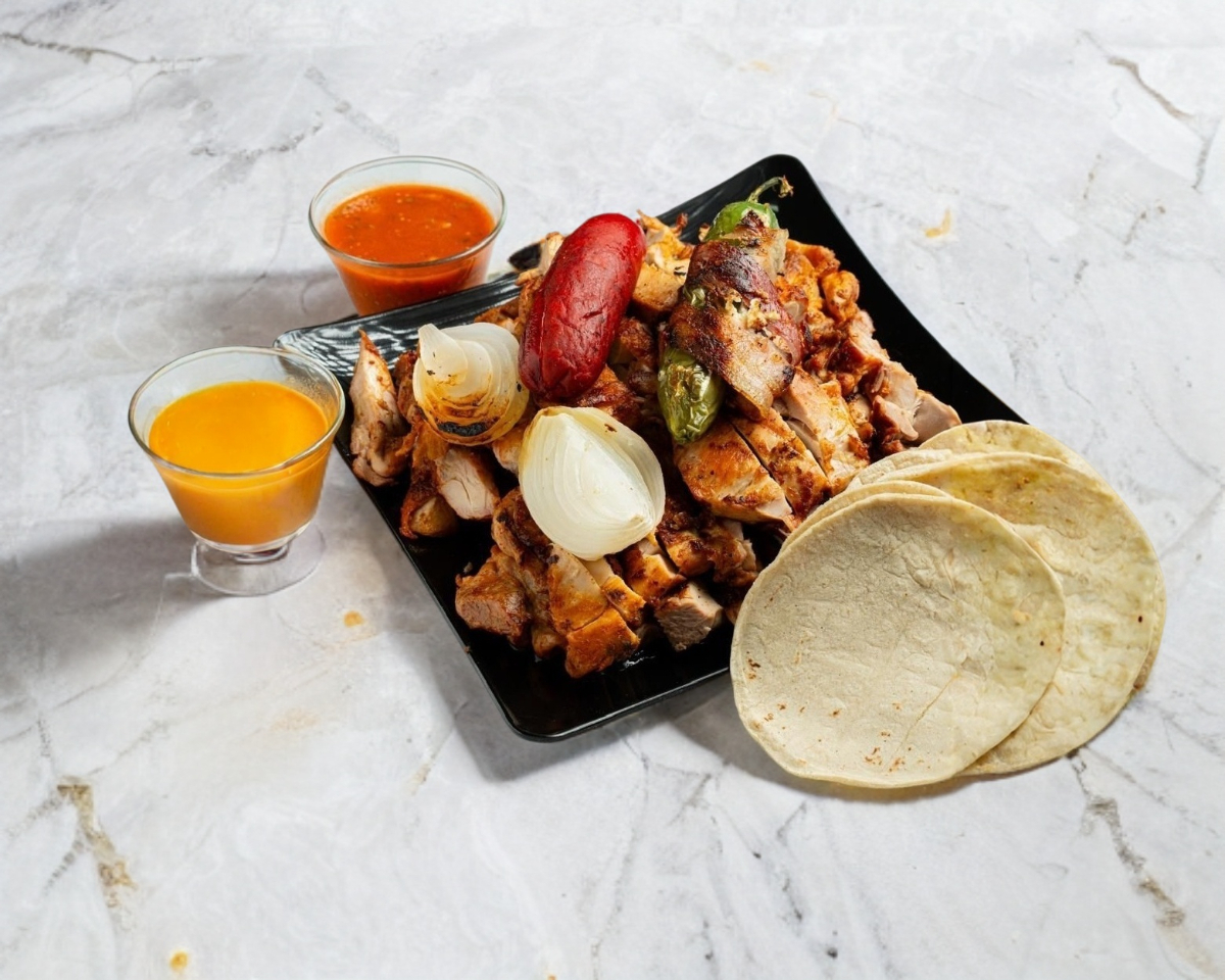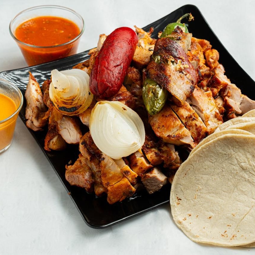4 Personas 1/2 arrachera, 172 de pollo, 2 salchichas y tortillas.