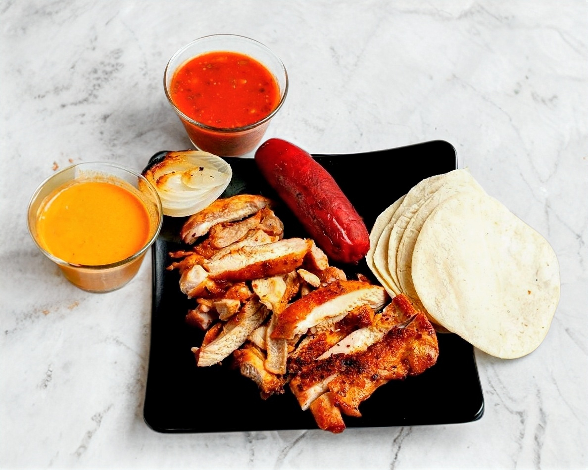 Para 5 personas 1 kg de pollo, salchicha, chile Philadelphia y tortillas.