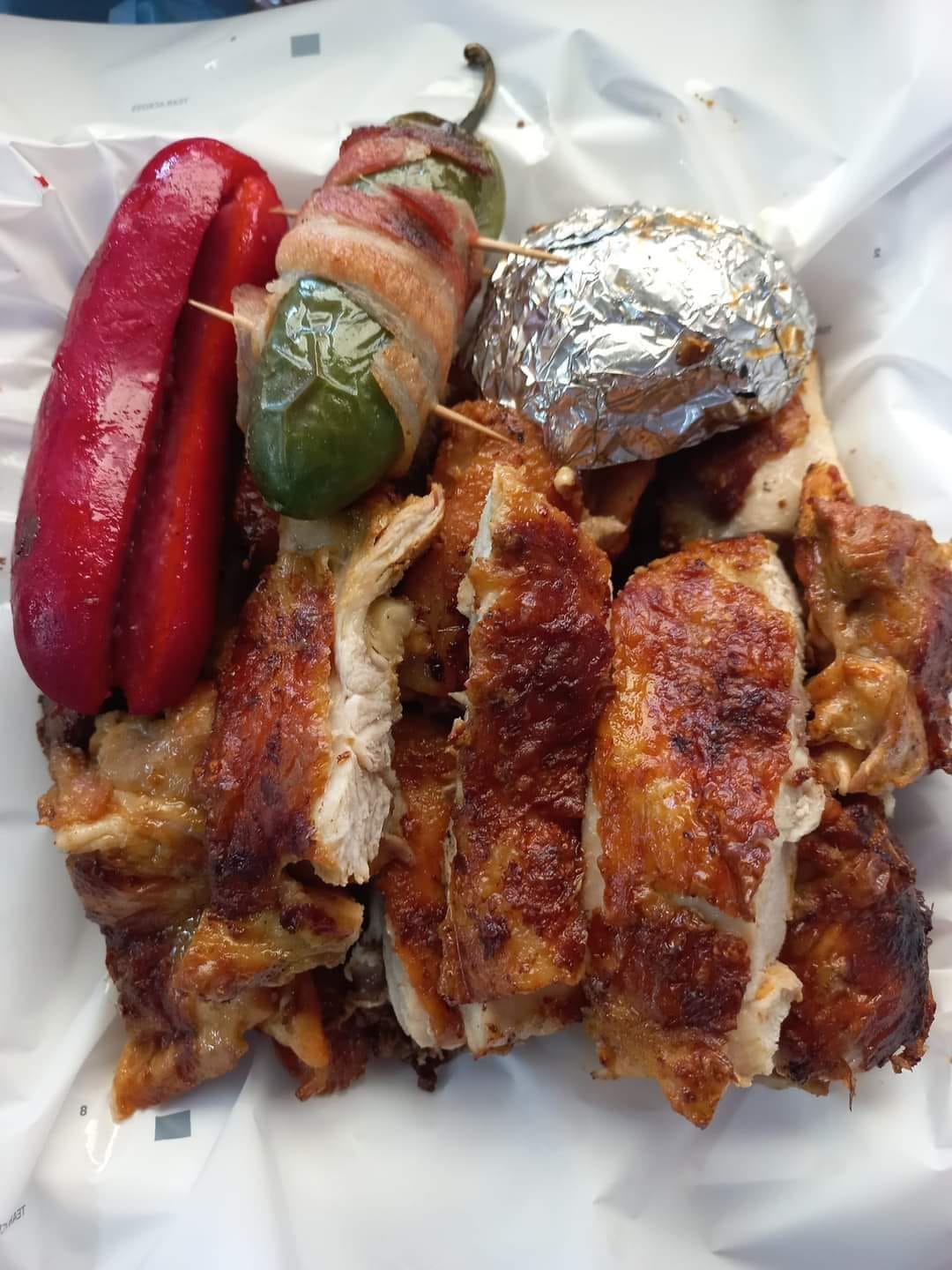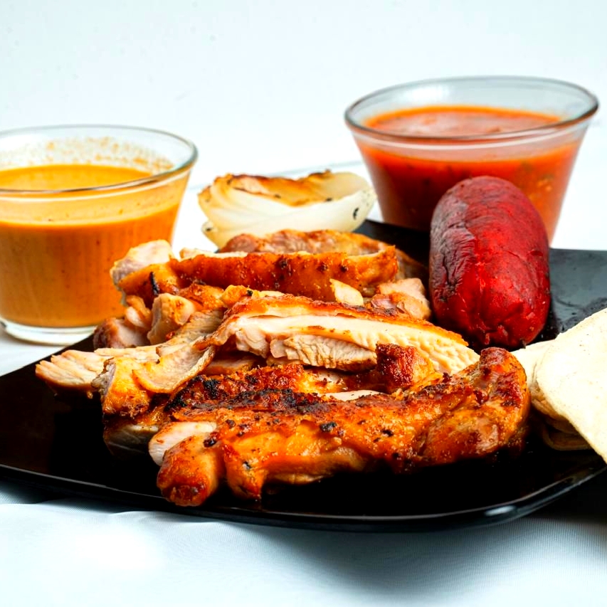1/2 kg De pollo asado, gratis salsa (roja y verde) y totopos, salsa jalapeño y tortillas.