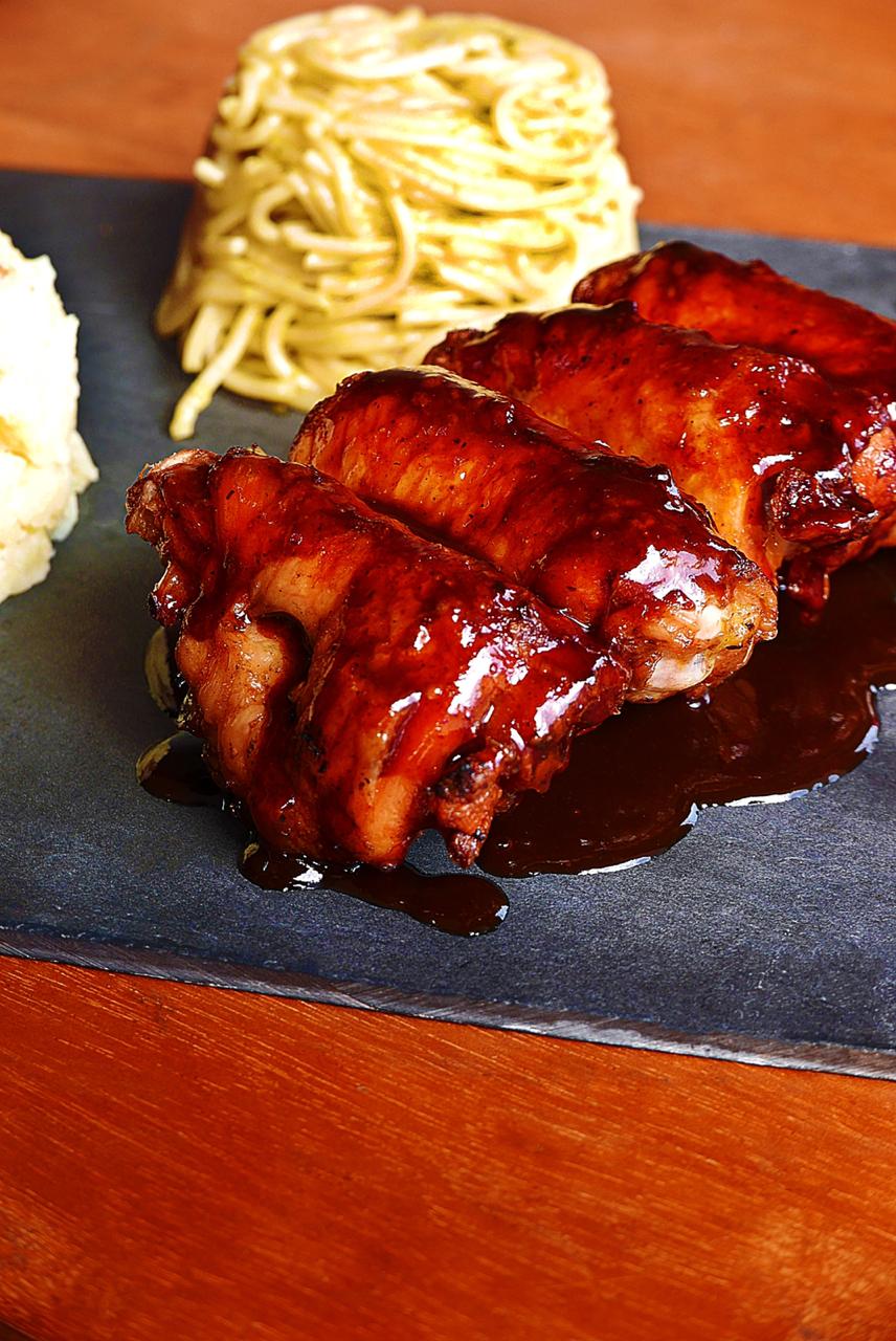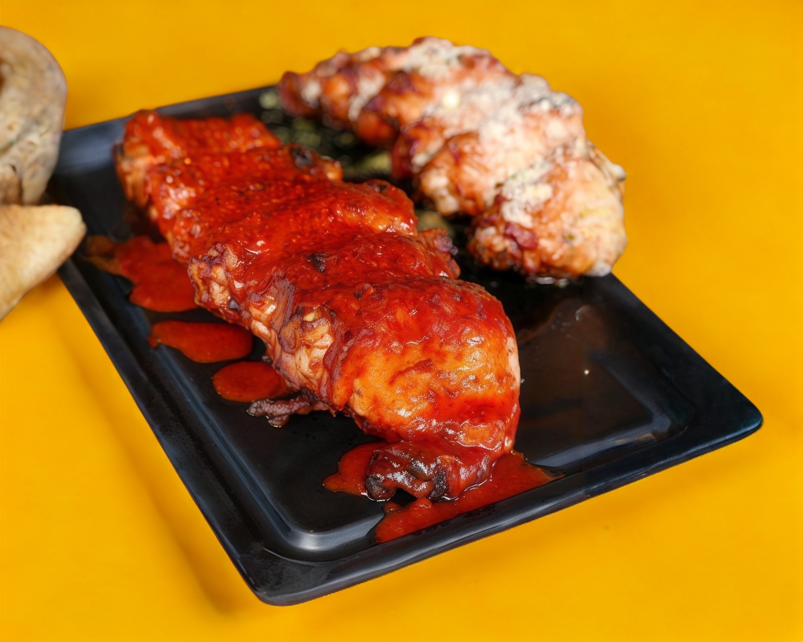 Espada Y Media (18) muslitos bañados en salsa a tu gusto , acompañadas de dos de tus guarniciones favoritas