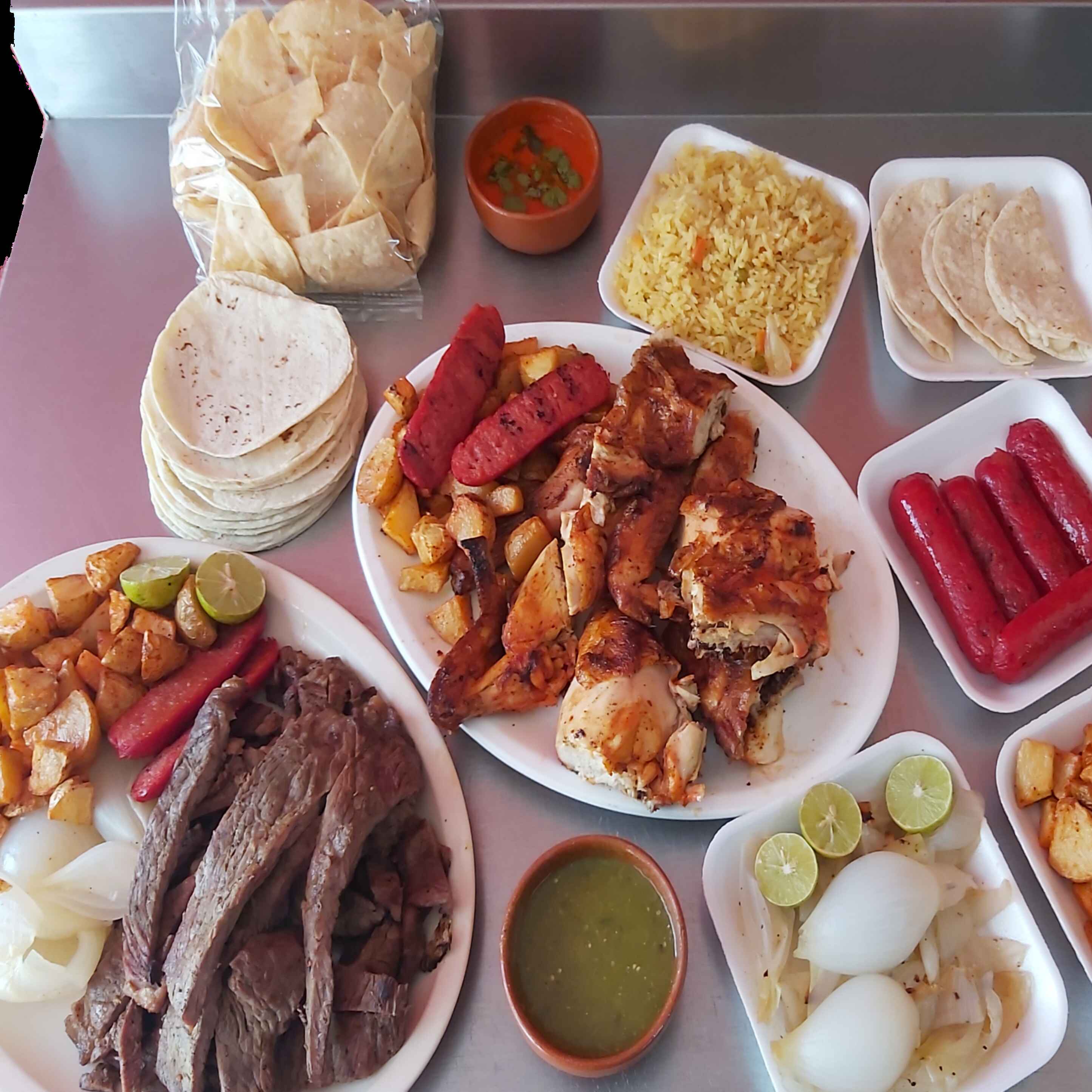 Un pollo entero más medio de carne asada incluye 12 tortillas- 3salsas-3 quesadilla-papa galana-salchicha asada-cebolla limom