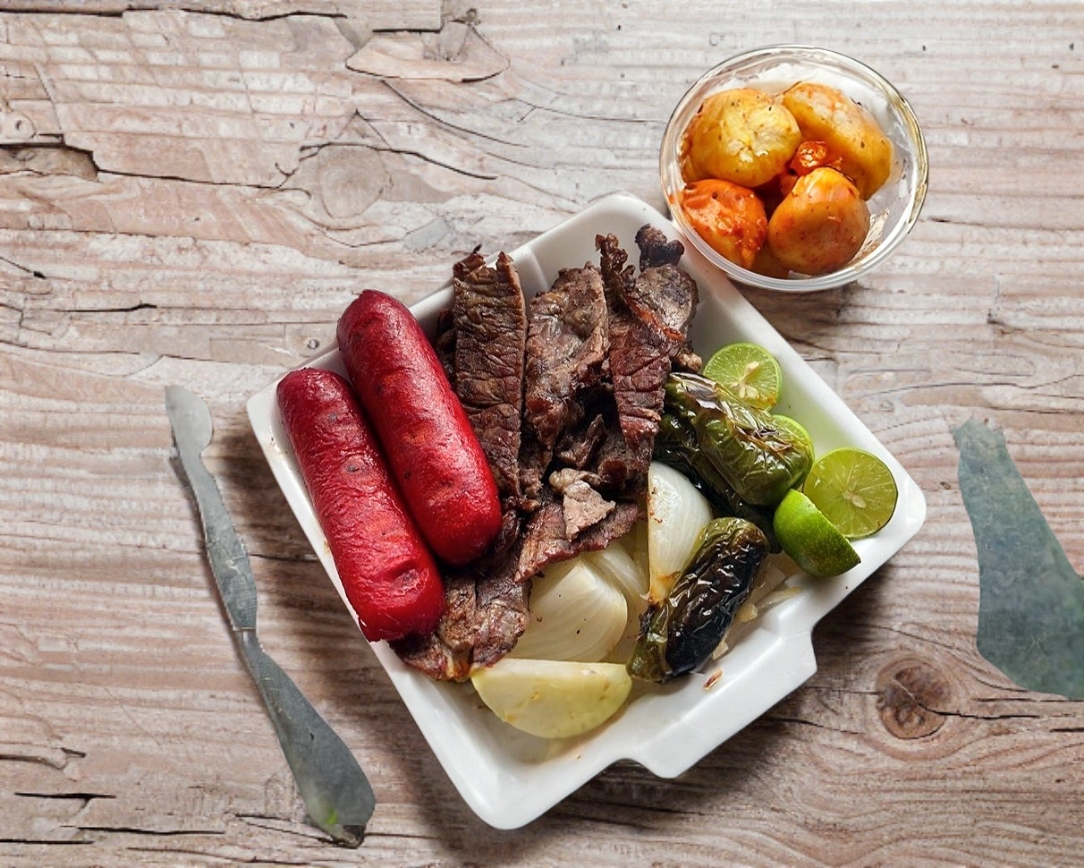 Porcion para 2 personas: 1/2 Kg de Carne Asada Incluye: 15 tortillas, 1 salchicha asada, cebolla asada, chiles toreados, salsas y limón.