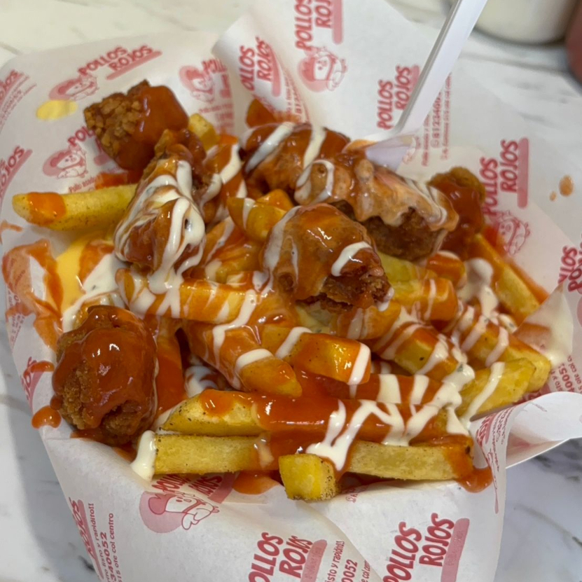 .360 grms de Papa a la Francesa bañadas con queso cheddar 10 pz de Boneless bañadas en salsa de tu eleccion