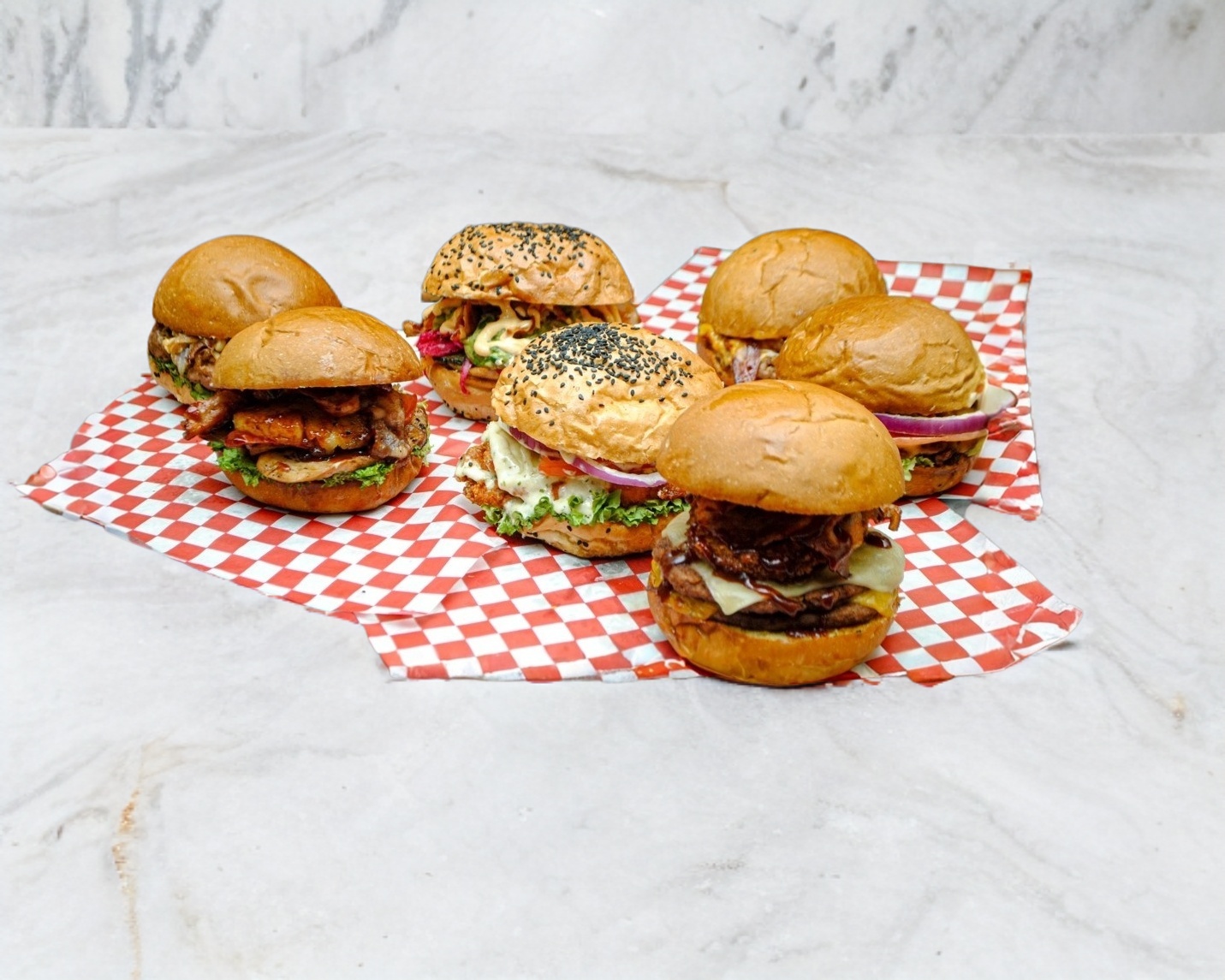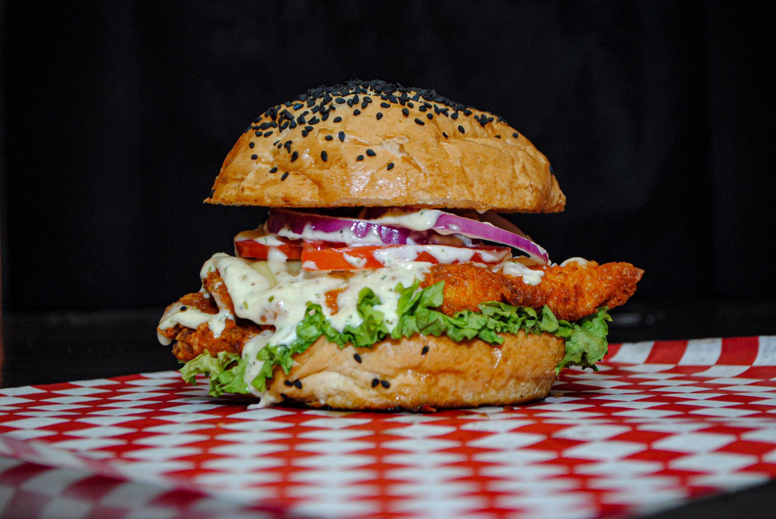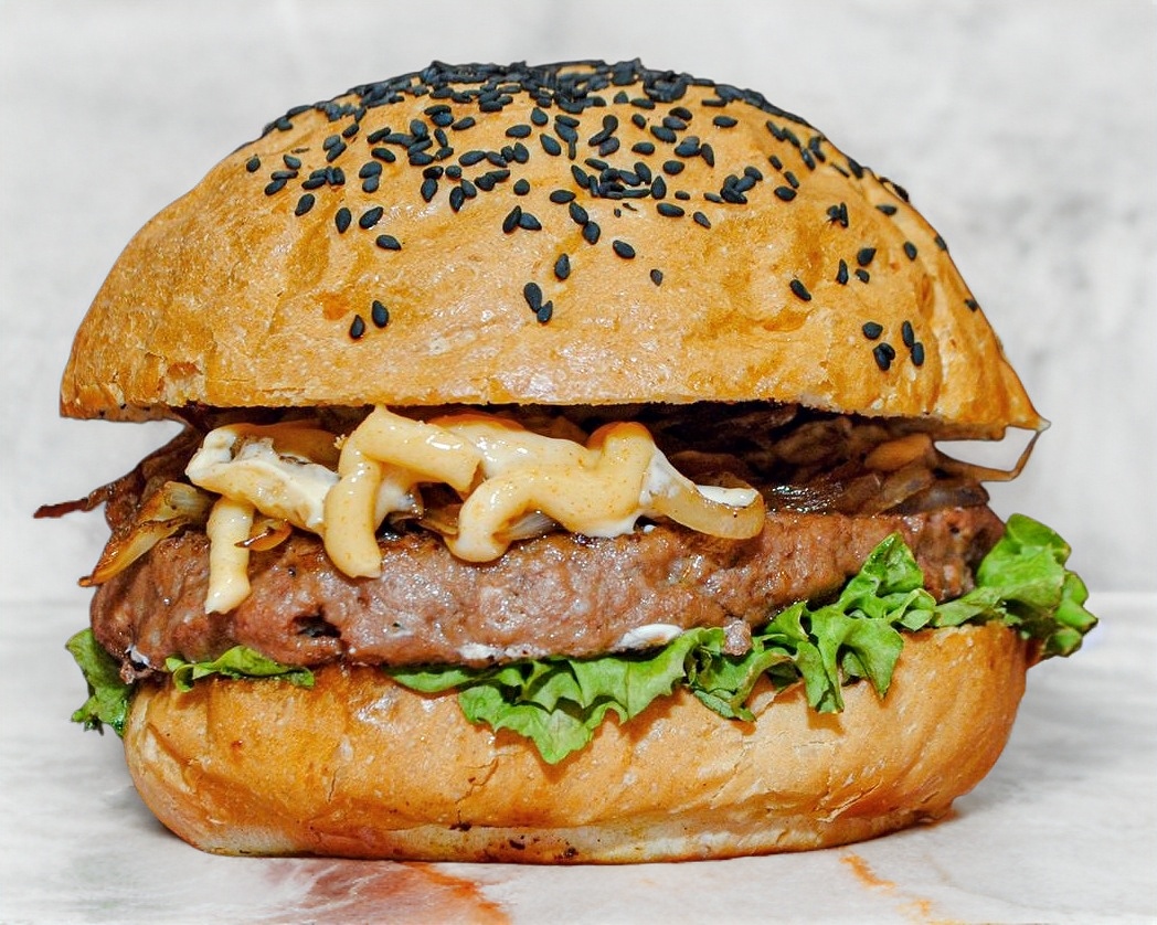 Carne de res rellena de Queso Philadelphia, cebolla caramelizada, lechuga y adereza de la casa.