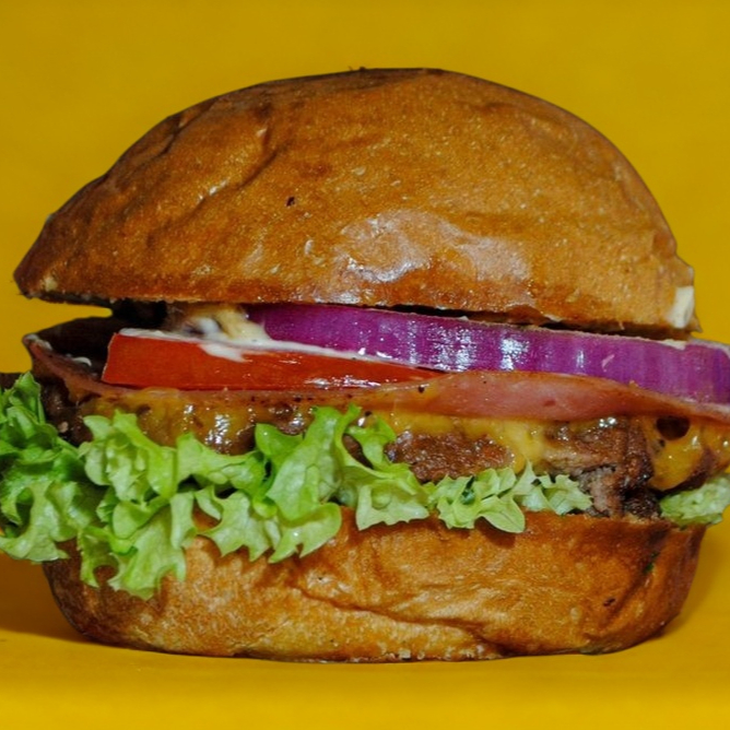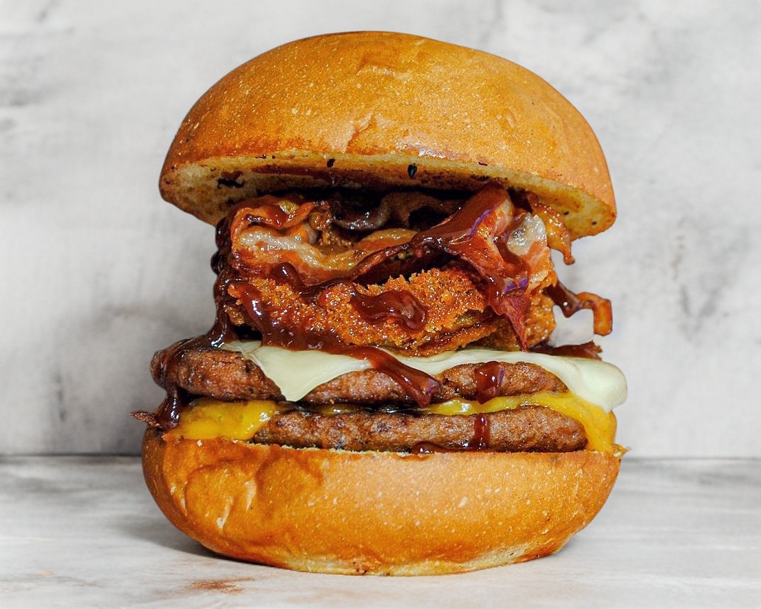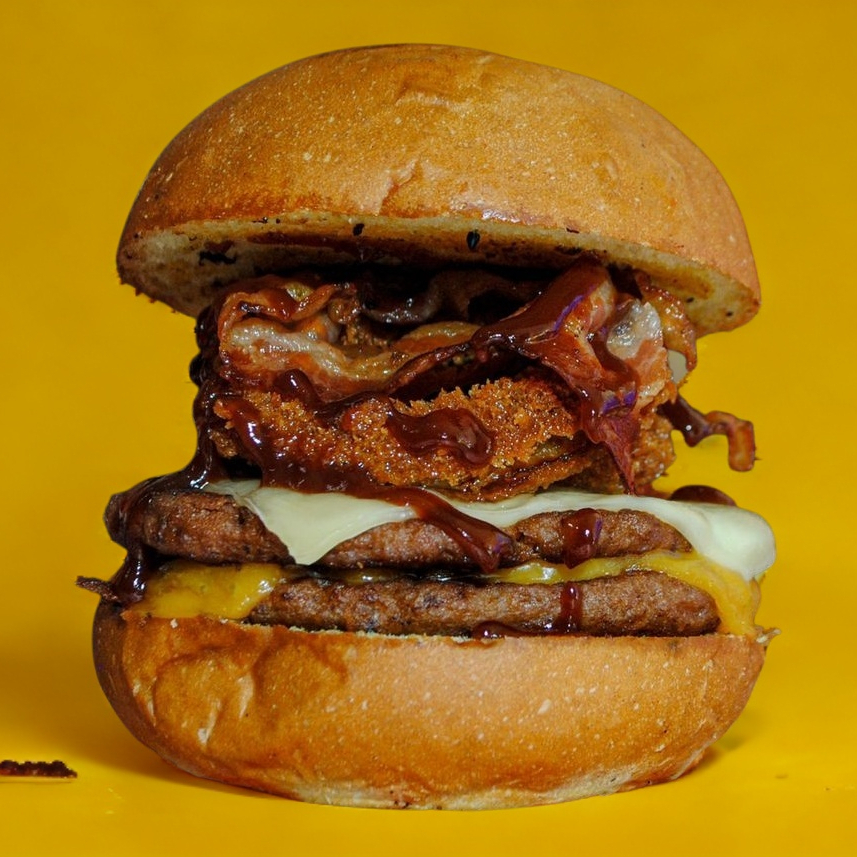 Doble carne, queso monterrey, queso americano, tocino, aros de cebolla, salsa BBQ.