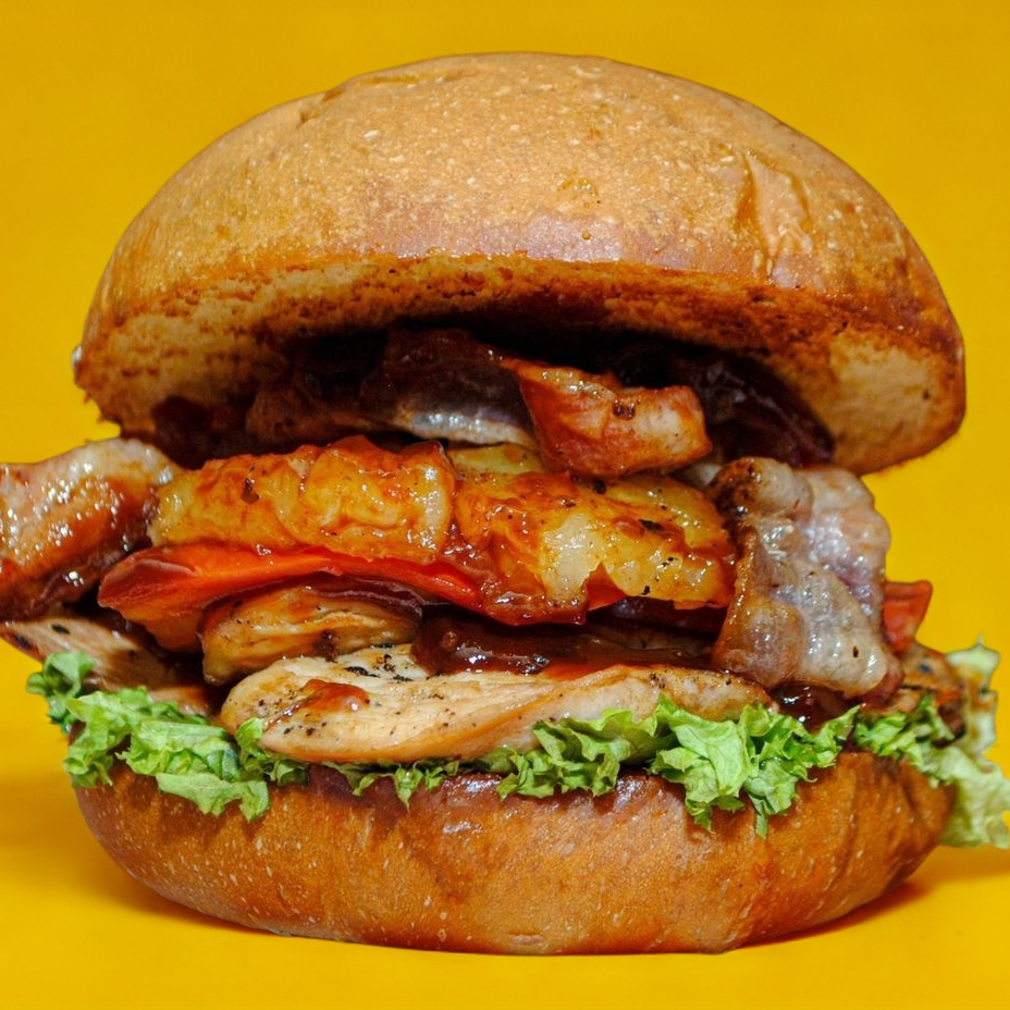 Lechuga italiana, tomate, pollo de la casa, tocino, salsa BBQ, piña asada.