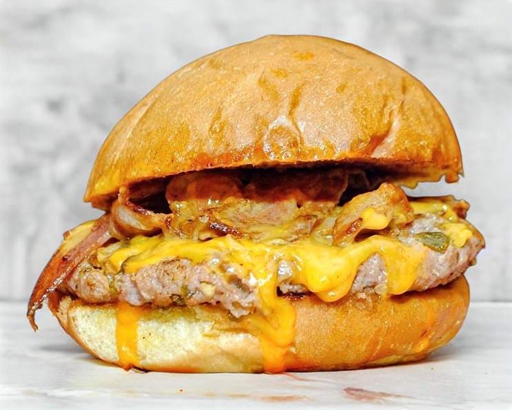Carne de res, jalapeño picado, queso americano, salsa de queso cheddar y tocino.