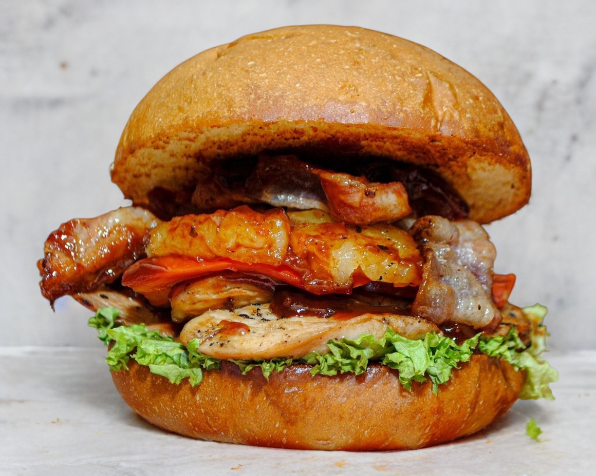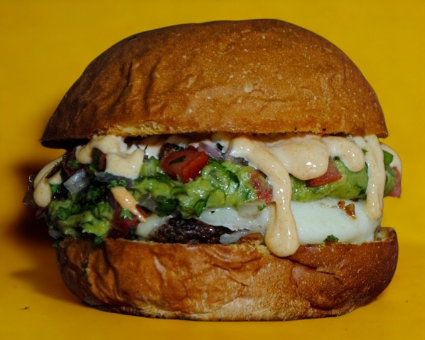 Pollo, guacamole, queso monterrey, tocino, chile jalapeño, cebolla curtida, aderezo mayo-habanero.