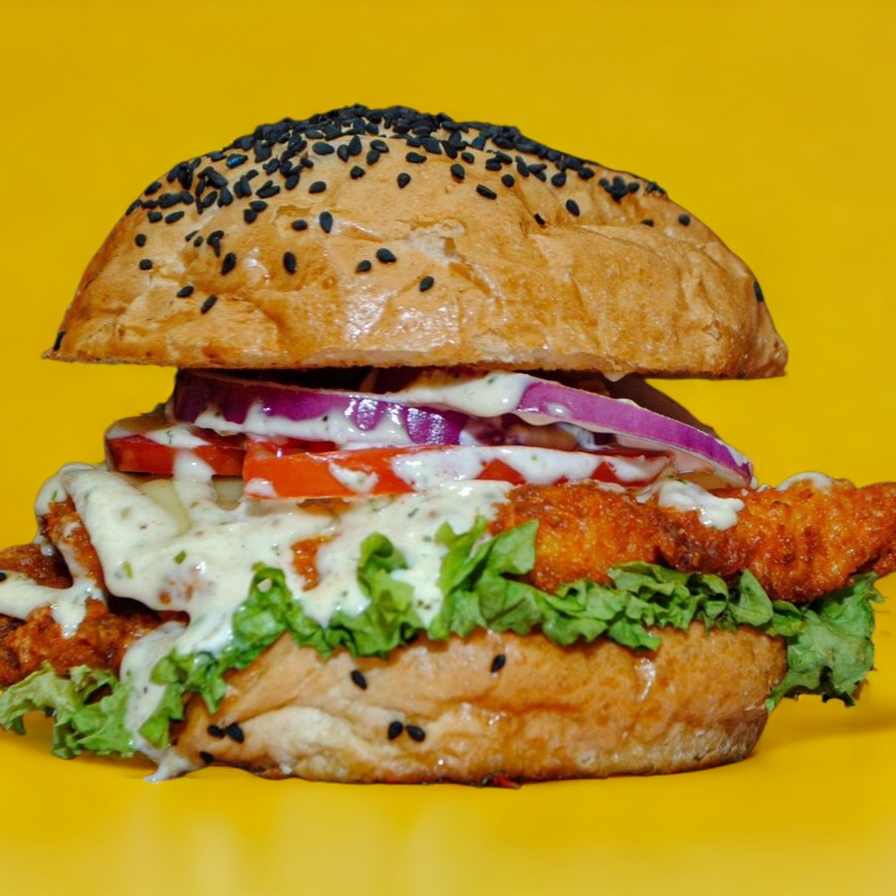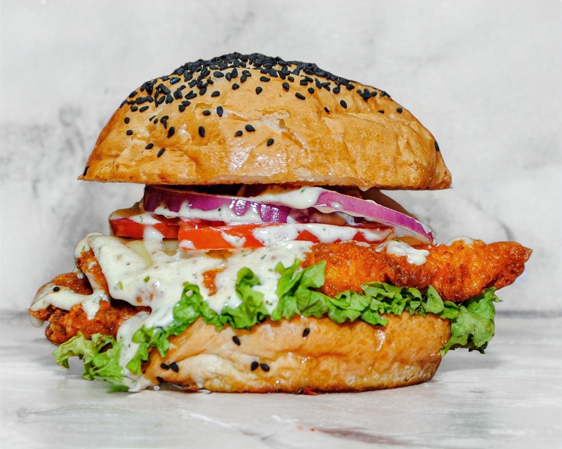 Pechuga empanizada bañada en salsa buffalo, queso monterrey, lechuga, tomate, cebolla, aderezo blue cheese.