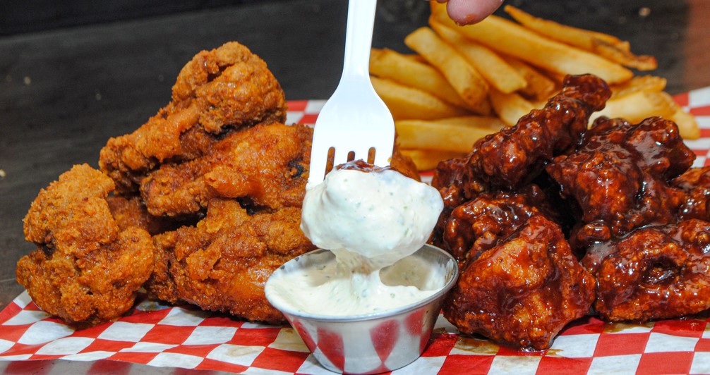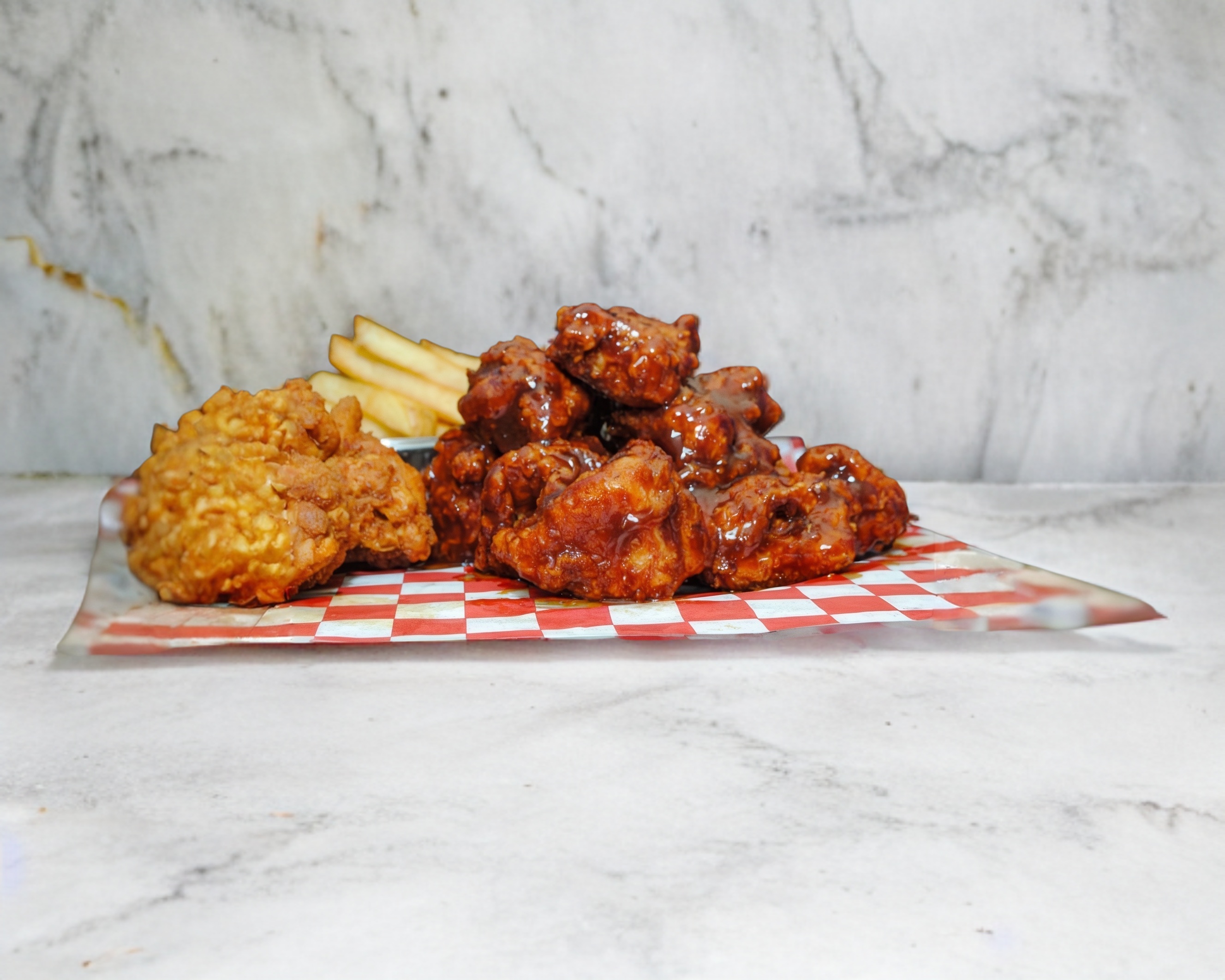 Combinación de papas a la francesa y tender naturales, con BBq, Buffalo o Mango habanero
