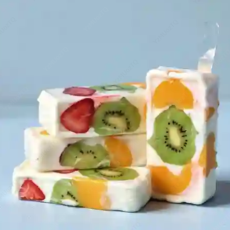 Paleta de yogurt con cóctel de frutas: fresa, kiwi, durazno, uva y cereza, sin azúcar añadido.