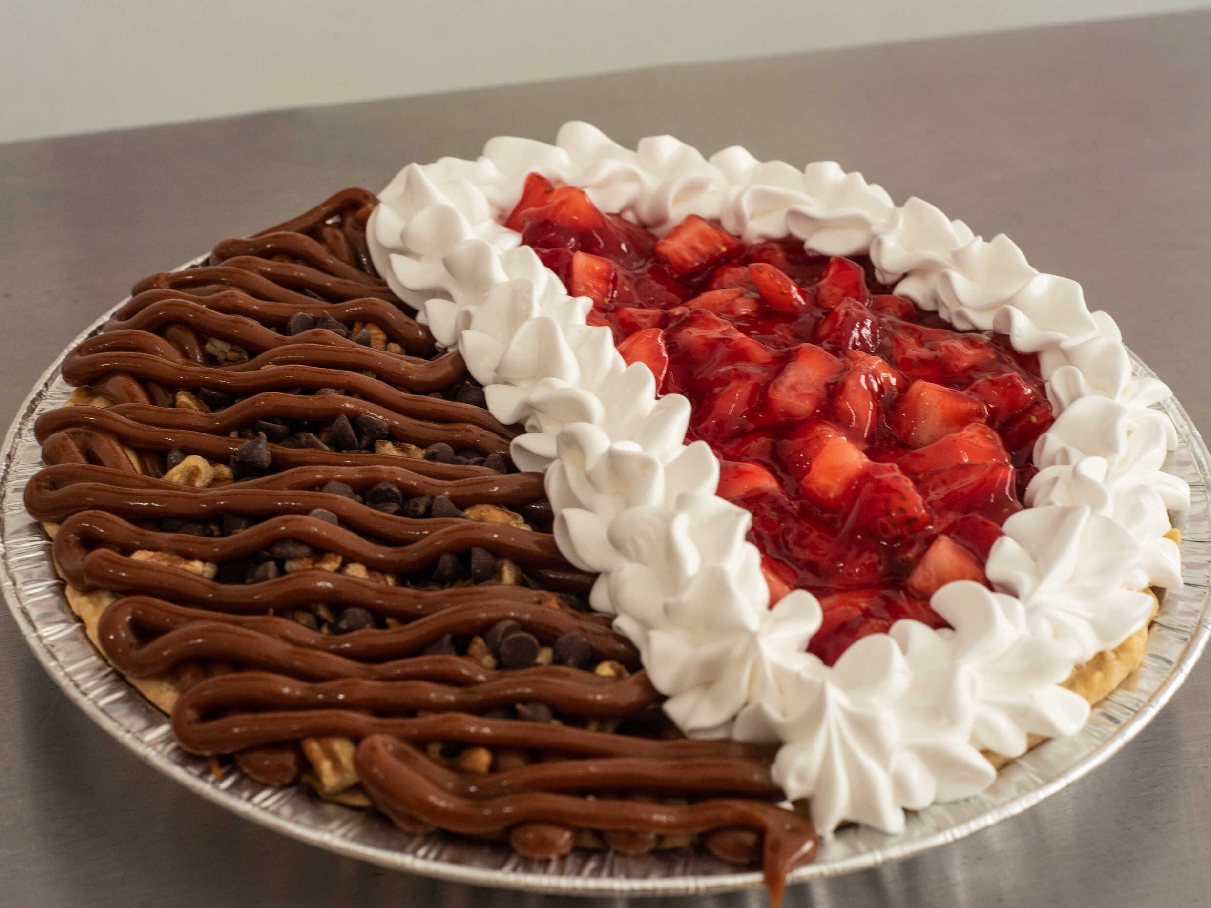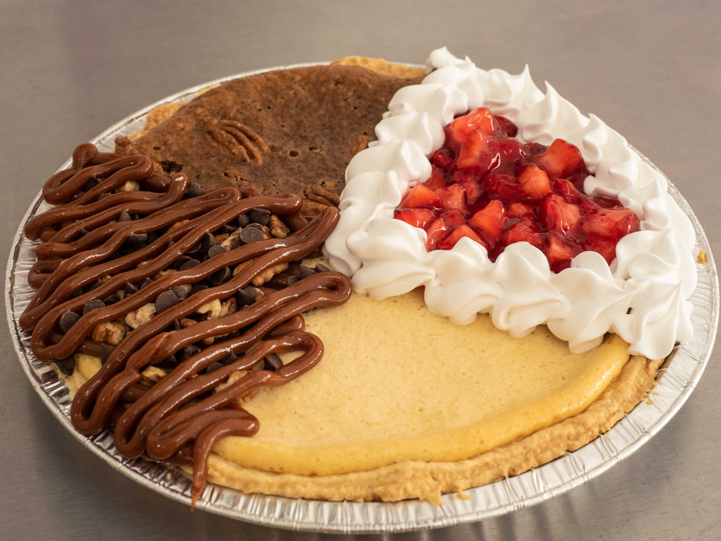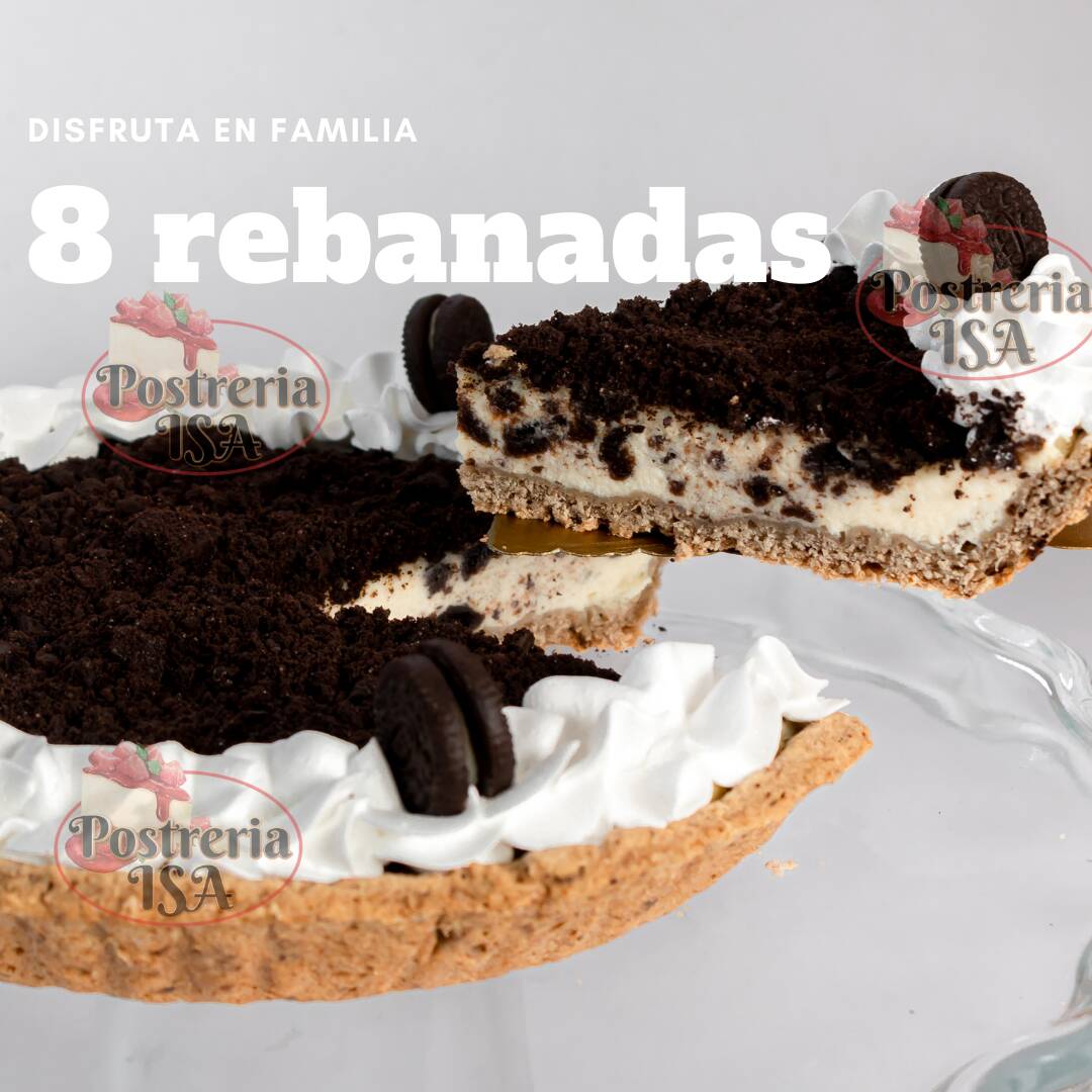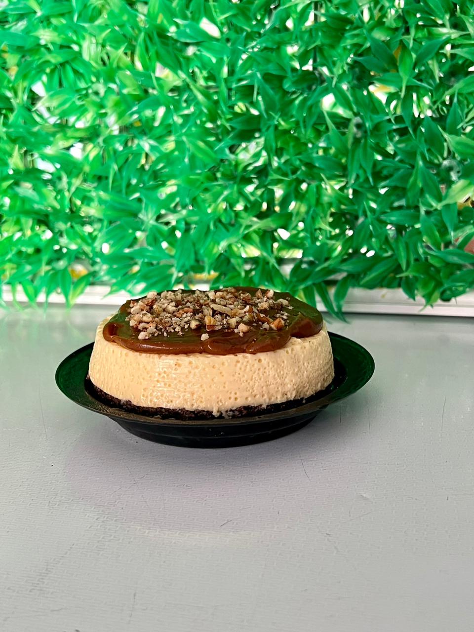 Delicioso pay de queso cubierto con cajeta, chispas de chocolate y nuez.