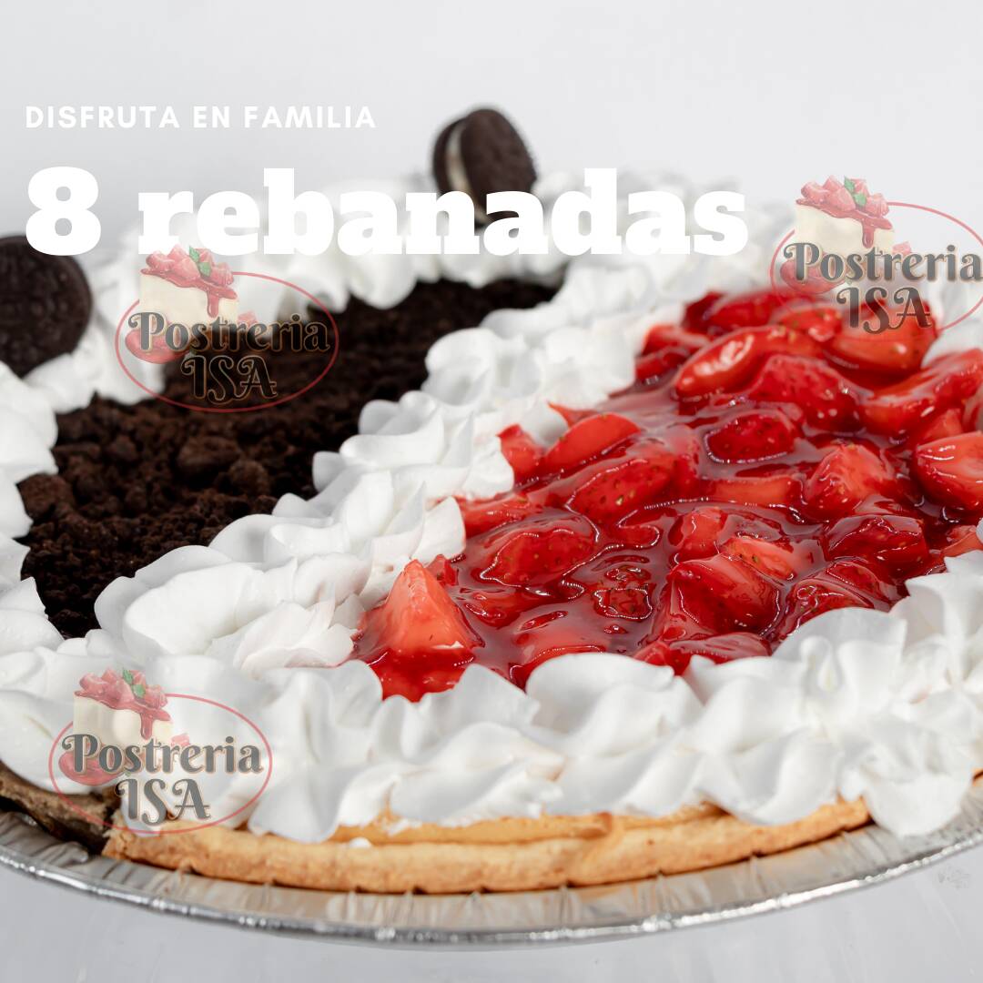 Delicioso mostachón cubierto con queso crema, betún y fresas. (Pastel de 16 rebanadas aprox.)