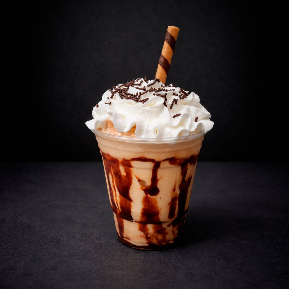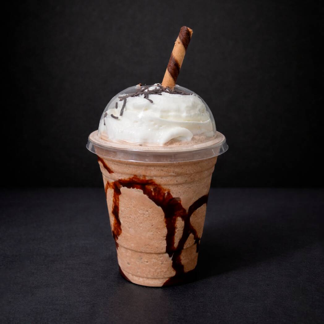 Frappe a base de leche, chocolate y cafe, decorado con chantilly, granillo de chocolate y Stick.