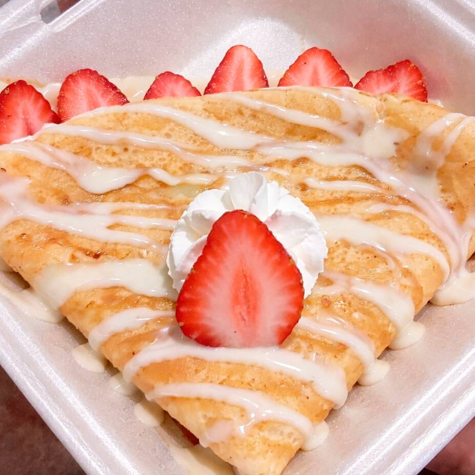 Crepa rellena de fresas con crema. Decorada con crema batida y lechera.