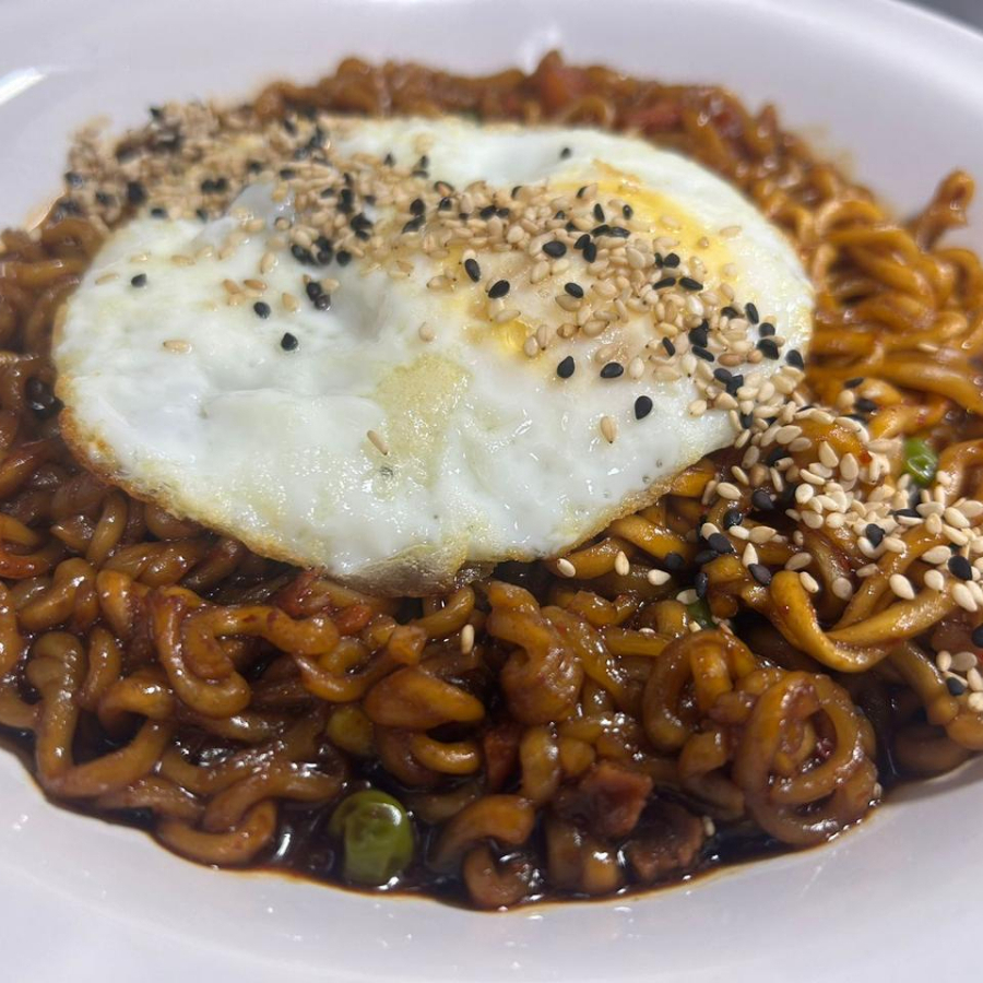 Una salsa exquisita de frijoles negros, fideos, verduras mixtas. Acompañados de huevo y ajonjolí.