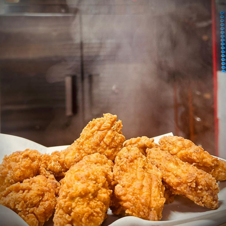 Pollo frito estilo coreano, con hueso, (1 Pollo completo), (2 Salsas de tu elección).
