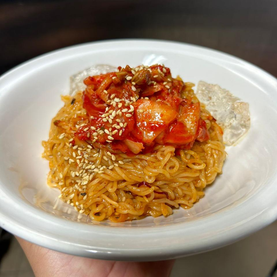 Es un platillo muy tradicional de Corea, son fideos fríos, acompañados con kimchi y una salsa ligeramente picante y un toque de dulce!.