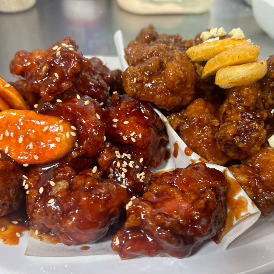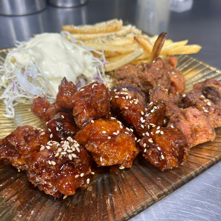 300 Gr de pollo frito coreano, ensalada, papas fritas y 2 salsas de tu elección.