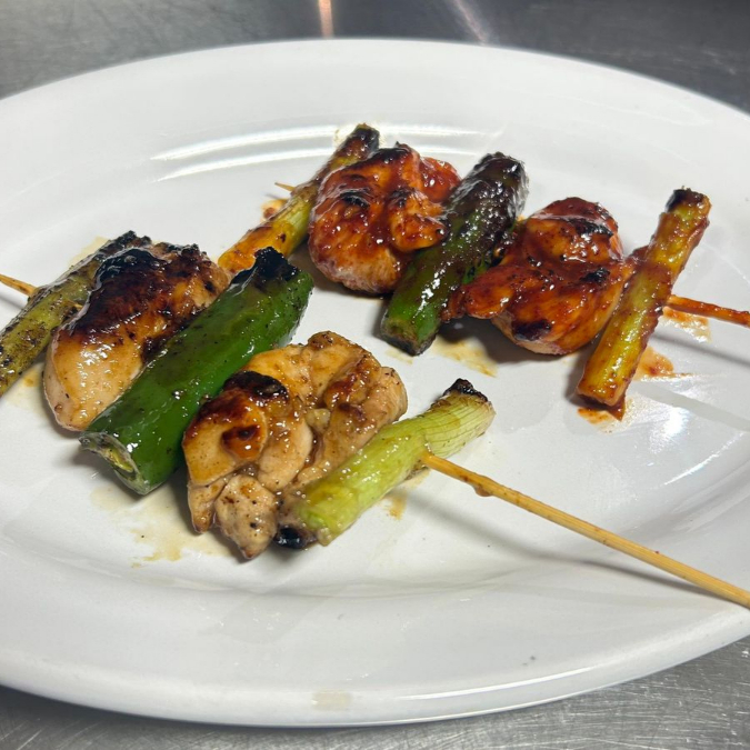 Brochetas de pollo Corena con cebollin y chile serrano. (2 tipos de salsa de tu elección) (SOYA O PICANTE)