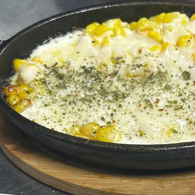 Elote amarillo, dulce, cremoso, cubierto con queso mozarela y perejil.