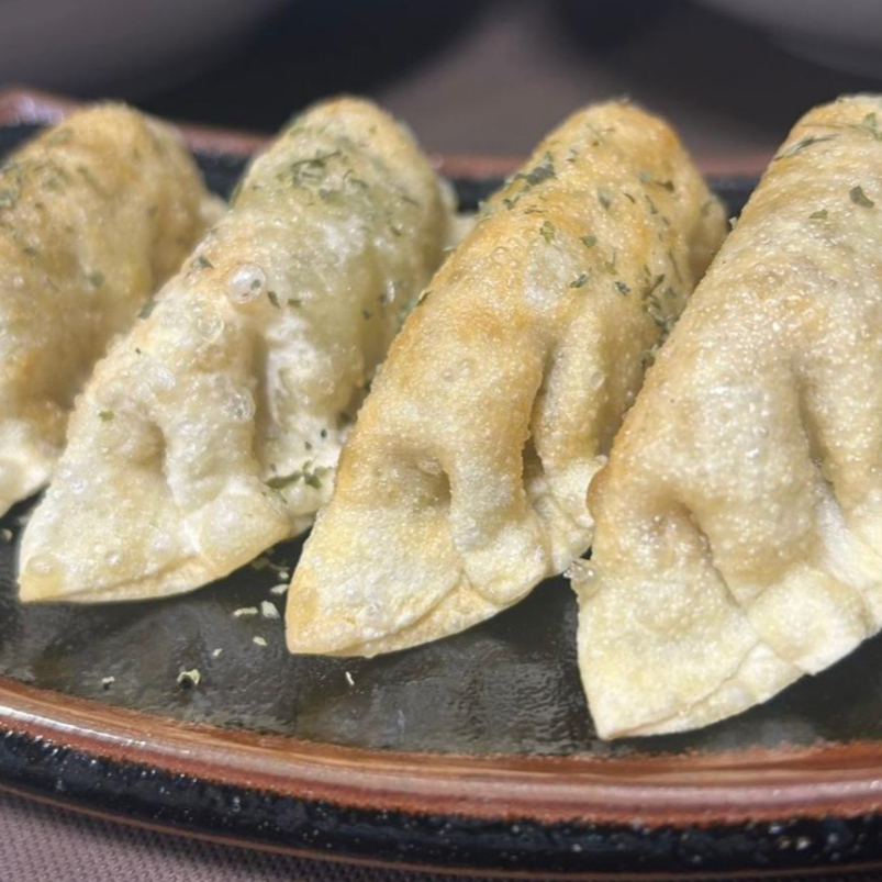 Exterior crujiente, relleno de carne de cerdo y verduras (4 piezas). Con salsa de soya con chile.