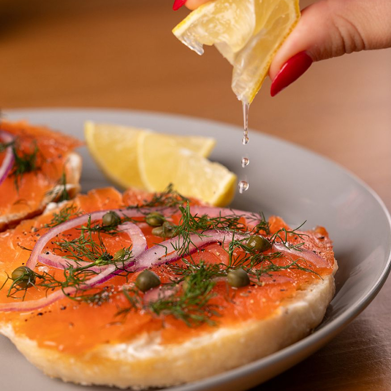 Bagel estilo New York con salmón ahumado, queso crema, alcaparras, eneldo, cebolla moraday lima, Incluye bebida.