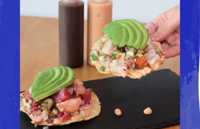 Camarón salsa de aguachile serrano, pepino y cebolla incluye 4 tostadas