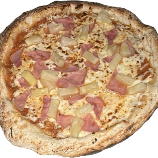 Queso mozarrella, jamon, piña sobre una salsa de tomate casera en una base de pizza artesanal de fermentación lenta 24 hrs