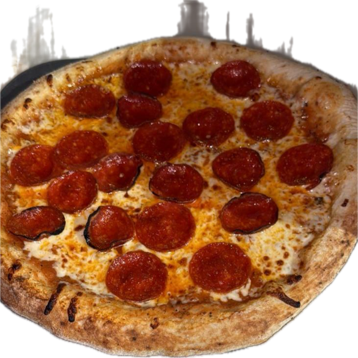 Queso mozarrella y pepperoni sobre una salsa de tomate casera y una masa de pizza de fermentacion artesanal (sin azucar añadida en la masa)