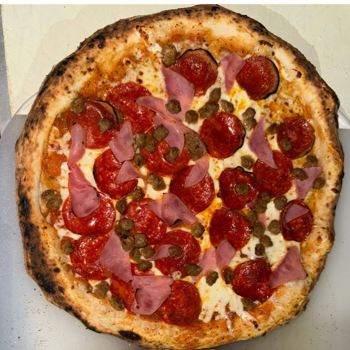 Queso mozarrella, pepperoni, salchicha italiana, jamon sobre una salsa de tomate casera y una masa de pizza de fermentacion artesanal