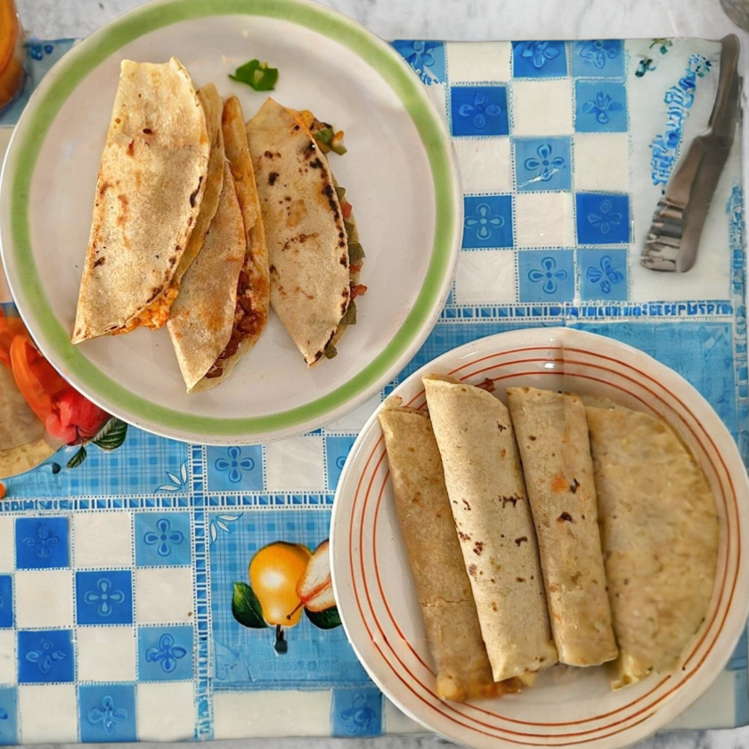 Deliciosa Quesadilla de nuestros guisos clásicos chicharrón verde o rojo, de aprox. 15 cm de largo en tortilla de maíz