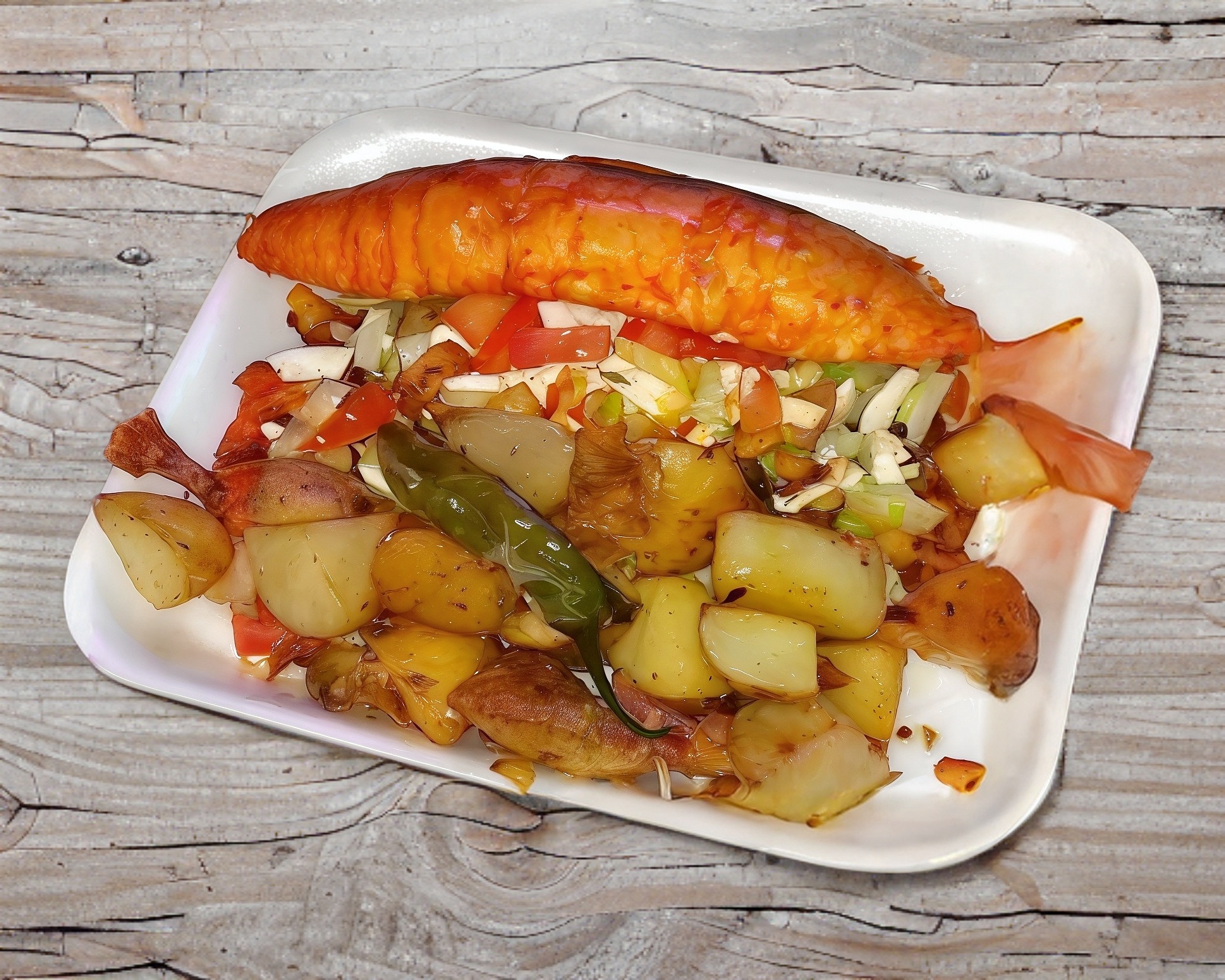 Es una porción de papa, lleva queso asadero, queso amarillo, mantequilla y carne asada y trompo acompañado con galleta saladas
