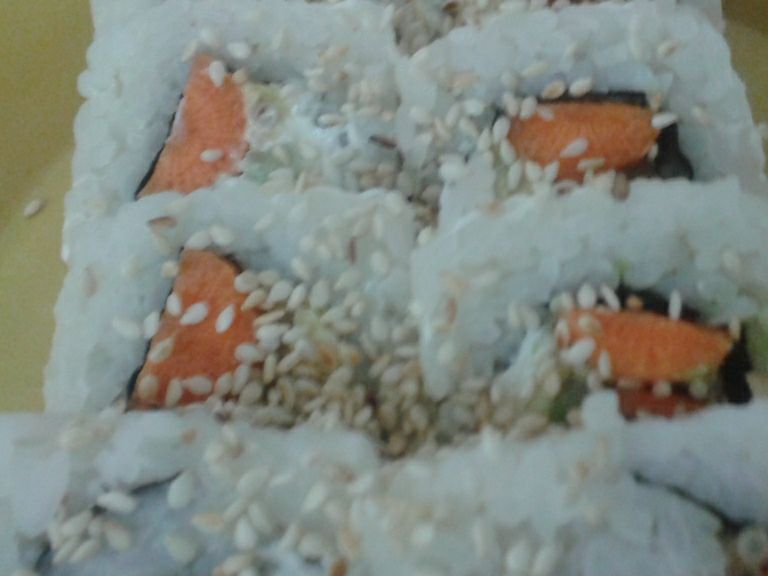 Pepino rallado, surimi, camarón, zanahoria rallada, mango, germen, piña y furicake.